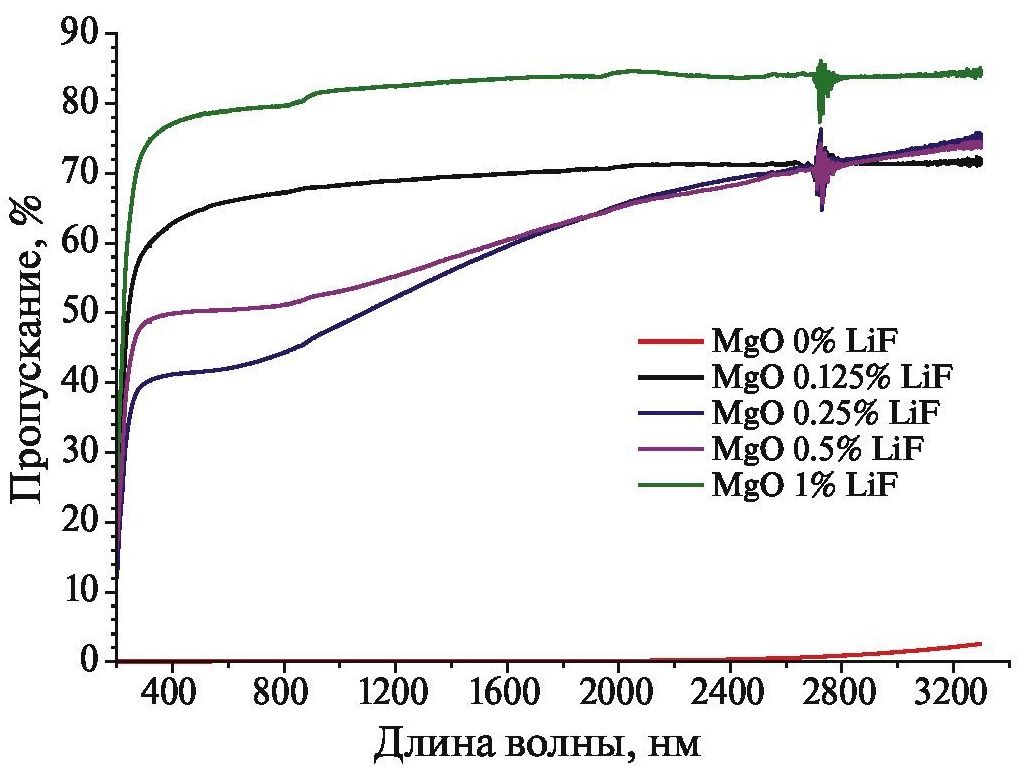 Оптические характеристики керамики MgO. Внешний вид керамических образцов MgO представлен на рис. 7, а спектры пропускания при комнатной температуре приведены на рис. 8. Видно, что даже небольшая добавка (0.125 мас.%) фторида лития существенно повышает пропускание керамики во всем оптическом диапазоне прозрачности материала. Увеличение содержание спекающей добавки обусловливает повышение прозрачности, а пропускания, близкого к теоретическому, керамика достигает при содержании фторида лития в прекурсоре 1 мас.%.
