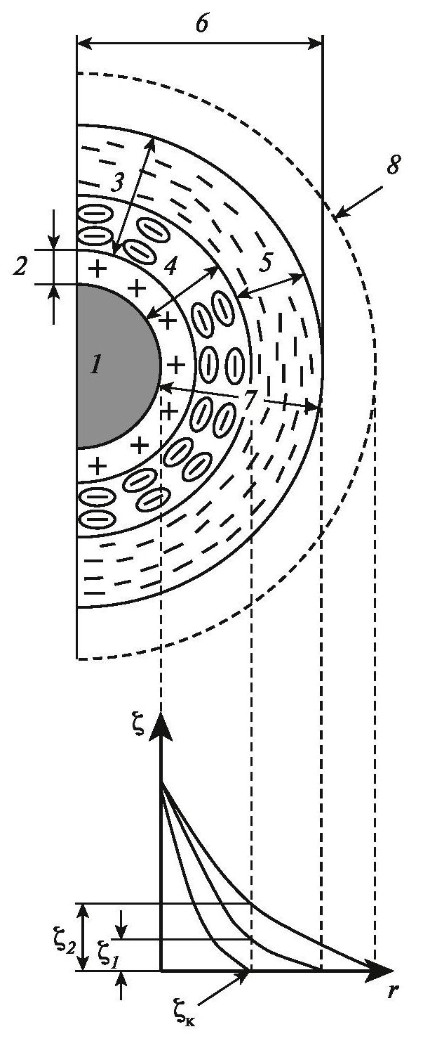 Рис. 1. Схематическое представление строения мицеллы и изменения величины дзета-потенциала в суспензии по мере удаления от поверхности керамической частицы: 1 – частица тонкодисперсного порошка, 2 – ионный слой, 3 – противоионный слой, 4 – адсорбционный слой, 5 – диффузный слой, 6 – мицелла, 7 – ДЭС, 8 – граница диффузного слоя при расширении ДЭС, ζ – электрокинетический потенциал (дзета-потенциал), r – расстояние от поверхности до частицы порошка.