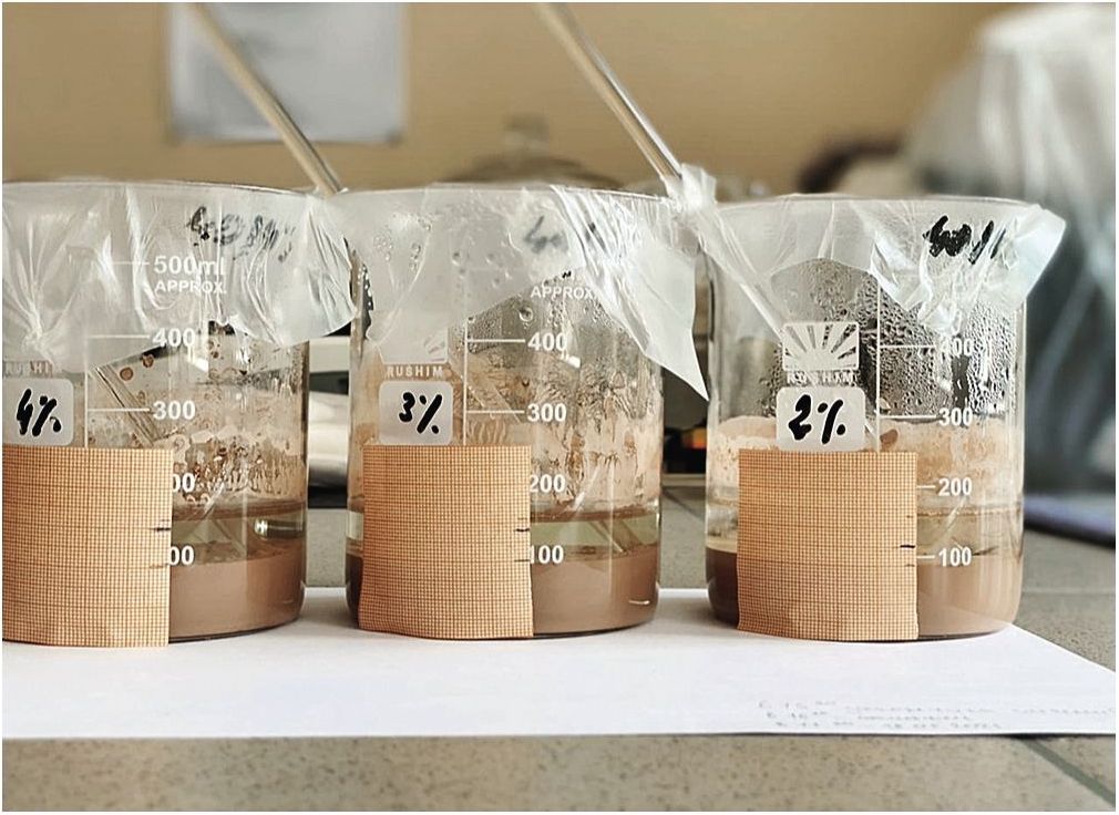 Рис. 2. Внешний вид суспензий с различной концентрацией ПВС (2–4%) при 40%-ном содержании твердой фазы после их выдержки при комнатной температуре (24 ч) для определения седиментационной устойчивости.