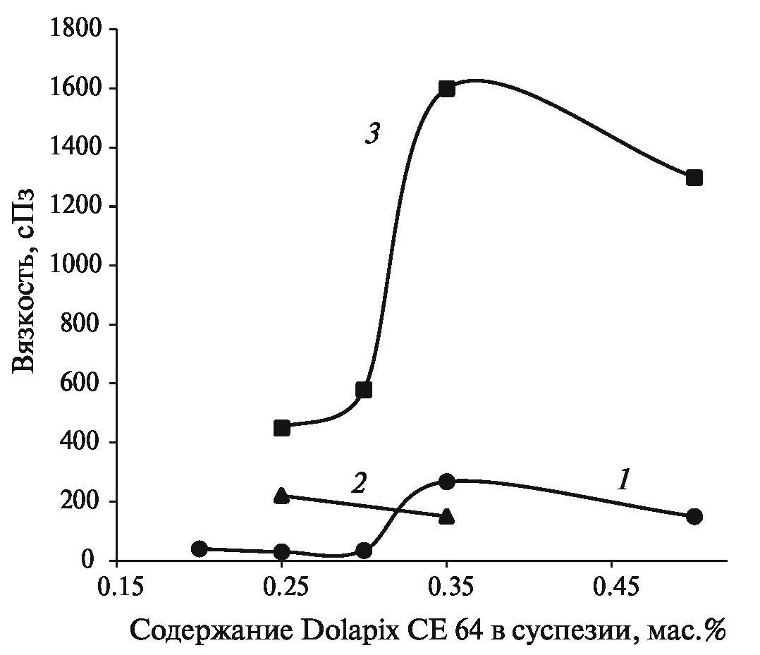 По мере повышения содержания твердой фазы в суспензии наблюдали нелинейное увеличение вязкости (рис. 5). При введении в суспензию 2.0% ПВС обнаружили более резкий рост вязкости по мере повышения содержания твердой фазы вследствие образования прочных структур или агрегатов частиц (кривая 3 на рис. 5).