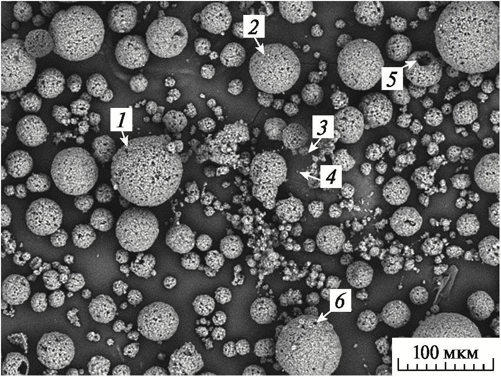 Морфология данного гранулята представлена на рис. 9. Видно, что полученные гранулы размером 10–70 мкм имеют округлую форму (1, 2, 3 на рис. 9), но их структура является “рыхлой” (6 на рис. 9). В некоторых гранулах присутствуют крупные поры размером до 10 мкм (5 на рис. 9).
