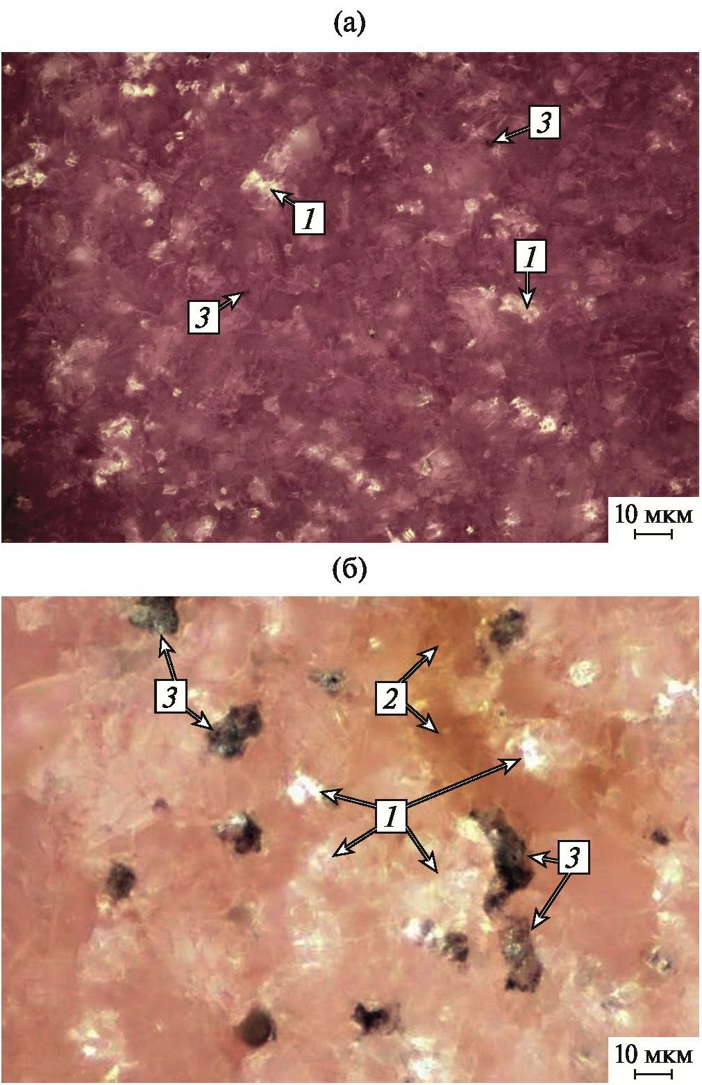 Рис. 11. Вид структуры разработанной (а) и промышленно производимой керамики ВК94-1 (б) с поверхности аншлифа в отраженном свете: 1 – стеклофаза, 2 – неравномерная окраска, 3 – пора.