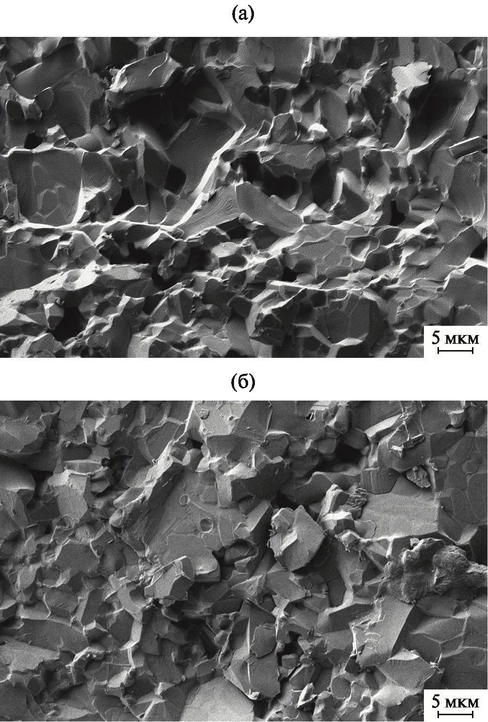 Рис. 12. Вид структуры разработанной (а) и промышленно производимой керамики ВК94-1 (б) с поверхности излома.