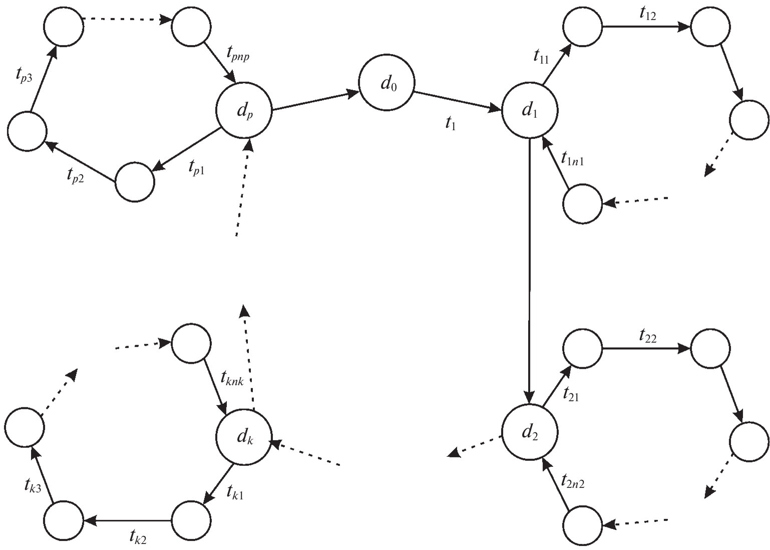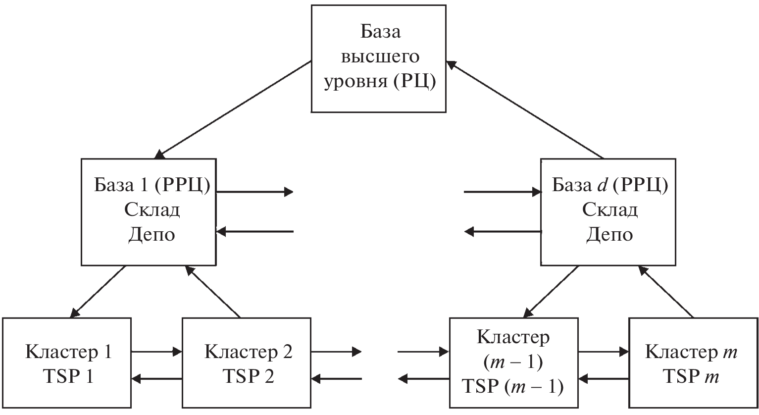 The problem of modeling real logistics systems arranged in a hierarchical manner is considered. Clusters of lower level consumers are formed that meet the time window (TW) constraints for each consumer and the cluster as a whole. In each such cluster, a traveling salesman’s route is constructed and the vertex closest to the central node, which is the vertex of reloading goods from heavy vehicles (Vs) to light Vs serving consumer clusters, is selected. The transshipment vertices, in turn, are combined into higher level traveling salesmen’s routes, taking into account TWs for routes of this level. The software implementation is tested on well-known networks. The technique is applicable for the synthesis of the central distribution center and system distribution centers of the lower level, as well as for calculating the required number of vehicles (agents).
