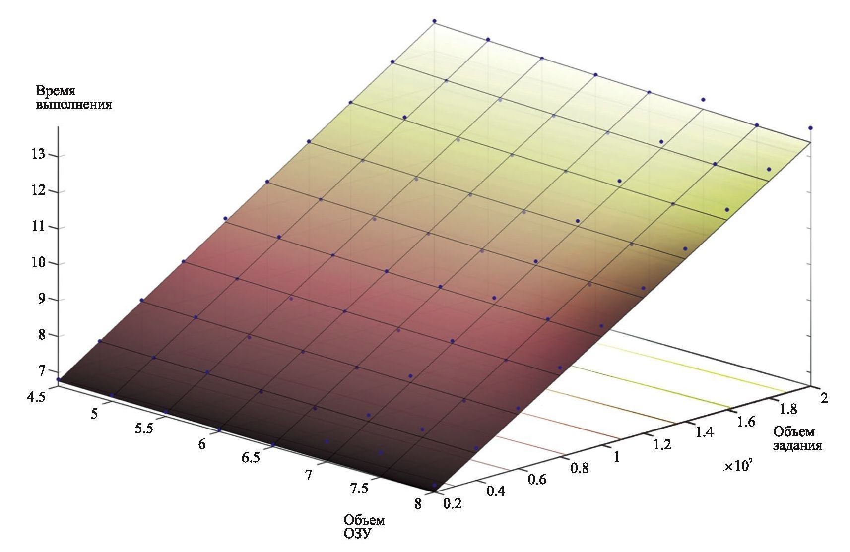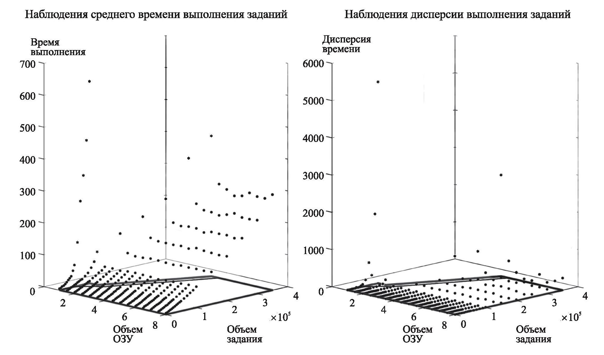 Анализируя рис. 3 и 4, можно сделать следующие заключения. Во-первых, невязки модели дисперсии значительно больше невязок модели среднего времени. Во-вторых, в области малого объема ОЗУ можно увидеть резкий рост как среднего, так и дисперсии времени выполнения задания даже при малом его объеме. Именно это обстоятельство вынудило сократить область возможных значений ресурсов узла, обеспечивающих эффективное выполнение пользовательских заданий № 1. Причиной такого замедления и нестабильной работы является недостаток оперативной памяти и активное использование механизма свопинга.