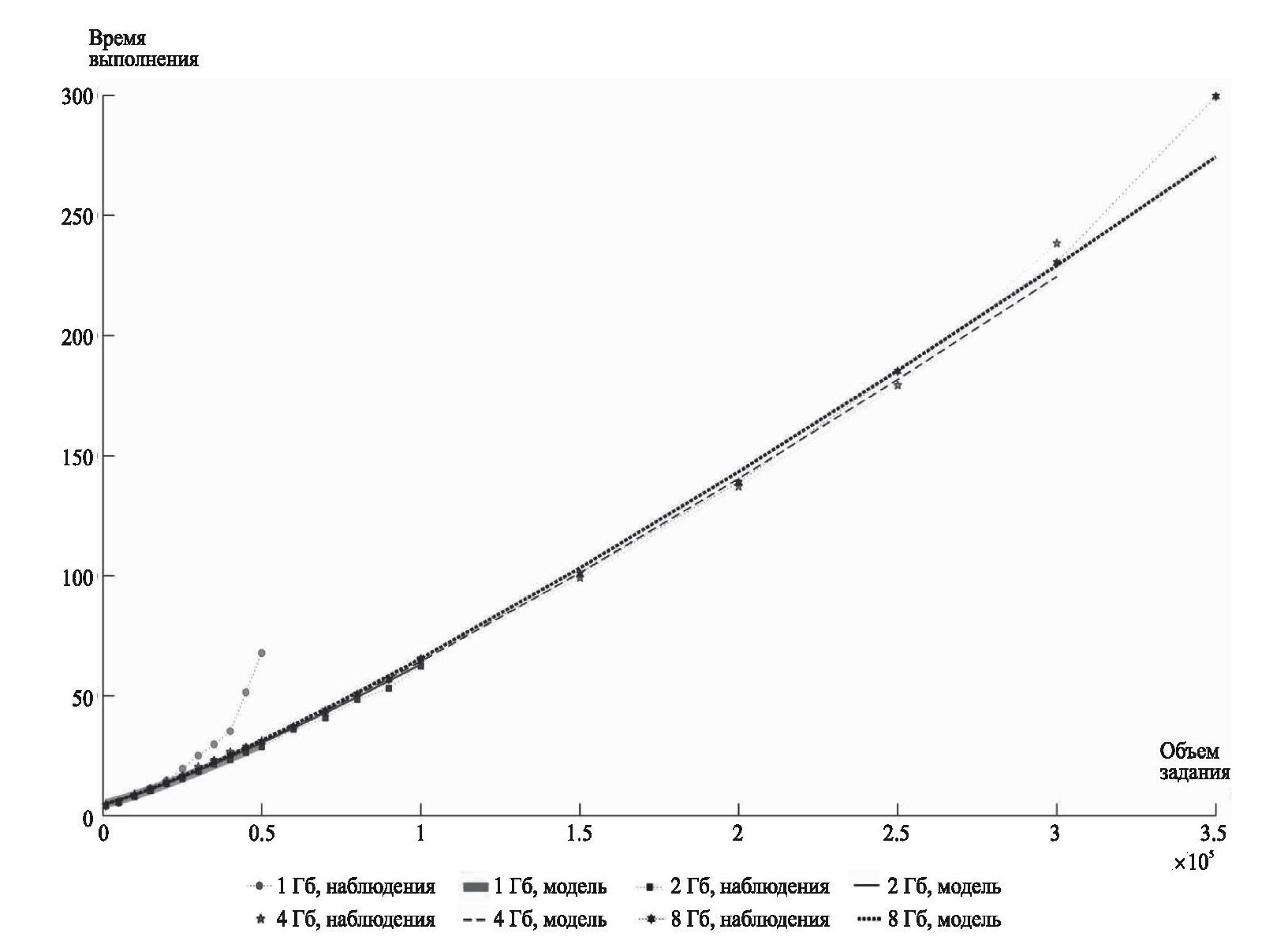 Рис. 5. Зависимость от объема задания для различных фиксированных объемов ОЗУ (1 ядро)
