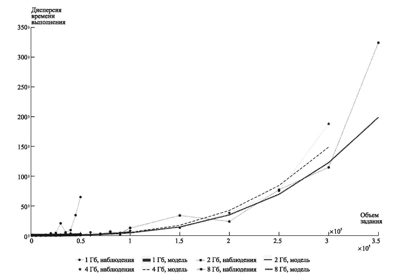 Анализ данных рисунков ведет к следующим заключениям. Начиная с объема ОЗУ 4,5 Гб все задание умещается в него, и механизм свопинга, существенно задерживающий процесс выполнения заданий, в этом случае не используется. По этой причине на рис. 3 и 7 можно заметить практически постоянное среднее время, не зависящее от объема ОЗУ, для заданий объемом до 250 000. В то же время для объемов 300 000 и 350 000 наблюдения демонстрируют некоторый рост среднего времени выполнения заданий с ростом объема ОЗУ. Заметим, что оцененный показатель степени при мал по модулю (равен 0.03), но имеет положительный знак. Таким образом, построенная модель среднего времени не обладает свойством локального невозрастания по переменным , описывающим ресурсы узла, т.е. имеет место нарушение свойства 2 из [1]: выбранная модель среднего времени, идентифицированная по полученным наблюдениям, строго возрастает с ростом ресурса . Для этого имеются две причины. Во-первых, задачи оптимизации (2.4) и (2.5), решаемые для идентификации параметров моделей и , не содержали ограничений на переменные , : введение дополнительных ограничений обеспечило бы выполнение свойства 2 из [1]. Во-вторых, класс функций , и , выбранный для описания модели, недостаточно гибок для описания свойства 2 из [1]. Для наблюдений выборочной дисперсии и ее модели, построенной по данным нагрузочных испытаний, ситуация иная: для заданий большого объема (300 000 и более) наблюдается тенденция к снижению дисперсии с ростом ОЗУ. Построенная модель отражает эту тенденцию: показатель степени при хотя и относительно мал по абсолютной величине, но имеет отрицательный знак: . По данным рисункам можно сделать следующий качественный вывод. На некоторых областях рост какого-либо ресурса (в данном случае объема ОЗУ) может нисколько не снижать среднее время выполнения задания, но в некоторых случаях даже увеличивает его.
