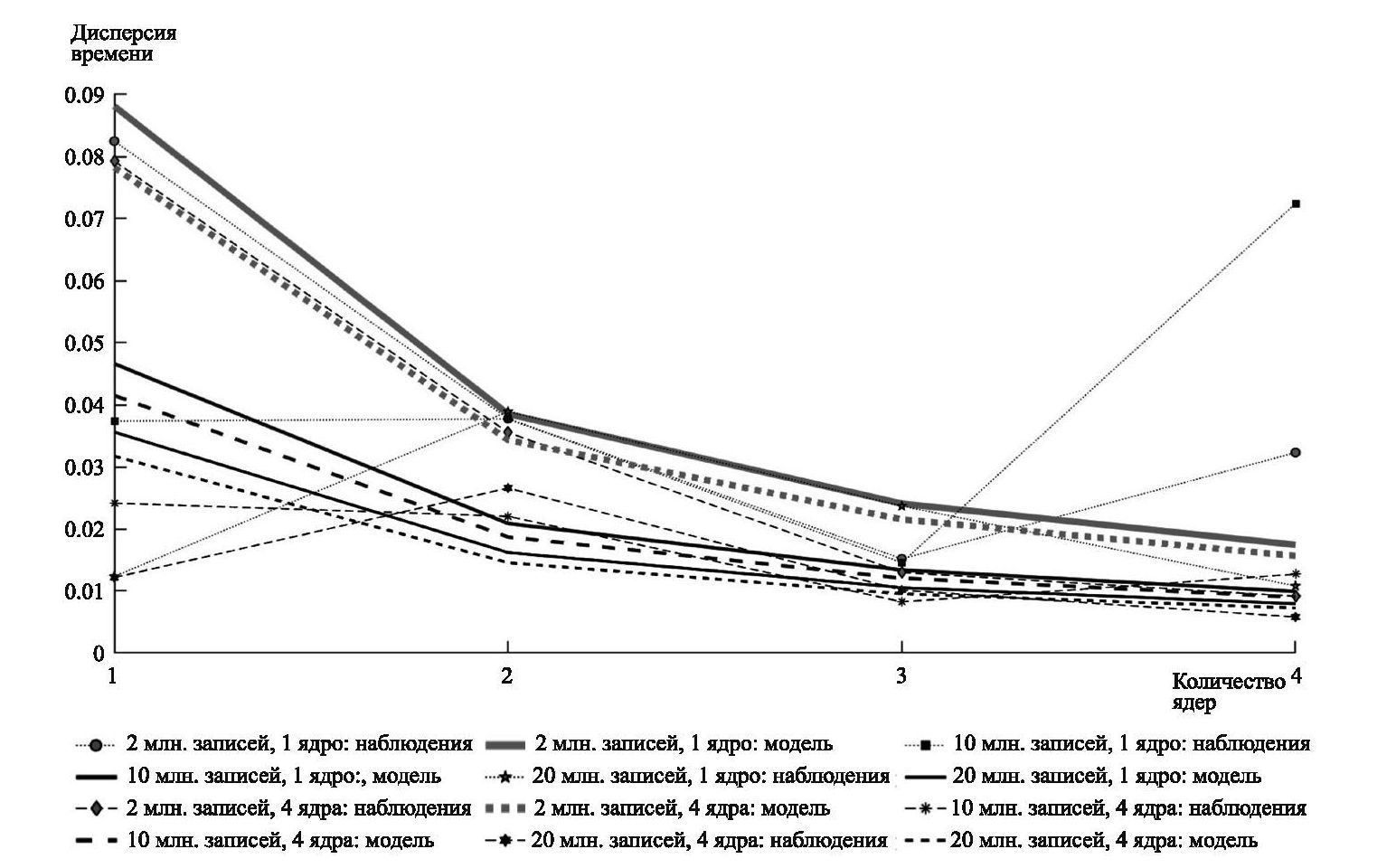 Для вычисления выборочных моментных характеристик – среднего значения времени и его дисперсии – каждый опыт с фиксированными параметрами проводился независимо 10 раз. В качестве возможных вариантов модели среднего времени выполнения заданий и его дисперсии выступали [1]