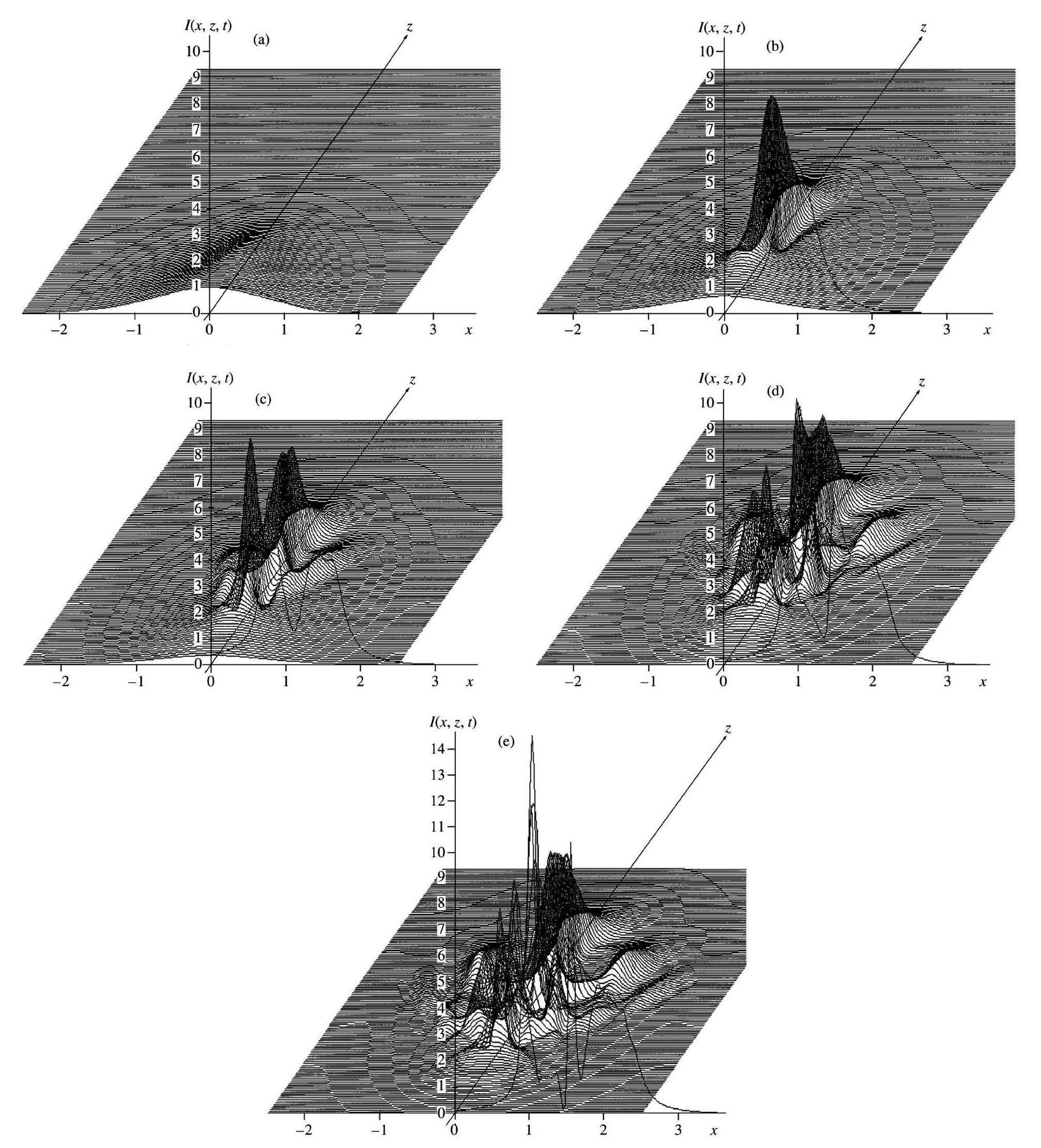 Рис. 2. Иллюстрация динамики интенсивности цилиндрического импульса I(x, z, t) при одинаковых значениях параметров задачи α, β, γ, δ, ν в разные моменты времени: (a), (b), (c), (d), (e)
