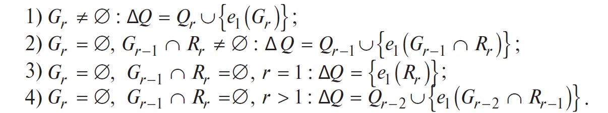 Для описания правил построения ΔQ введем обозначения: Q t MathType@MTEF@5@5@+= feaahGart1ev3aqatCvAUfeBSjuyZL2yd9gzLbvyNv2Caerbov2D09 MBdbqedmvETj2BSbqeeuuDJXwAKbsr4rNCHbGeaGqik8fkY=xipgYl h9vqqj=hEeeu0xXdi9arFj0xirFj0dXdbba91qpK0=yr0RYxfr=Jbb f9q8aq0=yq=He9q8qqQ8frFve9Fve9Ff0dmeaabaqaciaacaGaaeqa baqabeGadaaakeaaqaaaaaaaaaWdbiaadgfapaWaaSbaaSqaa8qaca WG0baapaqabaaaaa@3354@ , t= 1, r ¯ MathType@MTEF@5@5@+= feaahGart1ev3aqatCvAUfeBSjuyZL2yd9gzLbvyNv2Caerbov2D09 MBdbqedmvETj2BSbqeeuuDJXwAKbsr4rNCHbGeaGqik8fkY=xipgYl h9vqqj=hEeeu0xXdi9arFj0xirFj0dXdbba91qpK0=yr0RYxfr=Jbb f9q8aq0=yq=He9q8qqQ8frFve9Fve9Ff0dmeaabaqaciaacaGaaeqa baqabeGadaaakeaaqaaaaaaaaaWdbiaadshacqGH9aqppaWaa0aaae aapeGaaGymaiaacYcacaa5GcGaamOCaaaaaaa@3742@ , - набор столбцов матрицы L MathType@MTEF@5@5@+= feaahGart1ev3aqatCvAUfeBSjuyZL2yd9gzLbvyNv2Caerbov2D09 MBdbqedmvETj2BSbqeeuuDJXwAKbsr4rNCHbGeaGqik8fkY=xipgYl h9vqqj=hEeeu0xXdi9arFj0xirFj0dXdbba91qpK0=yr0RYxfr=Jbb f9q8aq0=yq=He9q8qqQ8frFve9Fve9Ff0dmeaabaqaciaacaGaaeqa baqabeGadaaakeaaqaaaaaaaaaWdbiaadYeaaaa@31FC@  с номерами j 1 ,,  j t MathType@MTEF@5@5@+= feaahGart1ev3aqatCvAUfeBSjuyZL2yd9gzLbvyNv2Caerbov2D09 MBdbqedmvETj2BSbqeeuuDJXwAKbsr4rNCHbGeaGqik8fkY=xipgYl h9vqqj=hEeeu0xXdi9arFj0xirFj0dXdbba91qpK0=yr0RYxfr=Jbb f9q8aq0=yq=He9q8qqQ8frFve9Fve9Ff0dmeaabaqaciaacaGaaeqa baqabeGadaaakeaaqaaaaaaaaaWdbiaadQgapaWaaSbaaSqaa8qaca aIXaaapaqabaGcpeGaaiilaiabgAci8kaacYcacaa5GcGaamOAa8aa daWgaaWcbaWdbiaadshaa8aabeaaaaa@39FF@ ; R t MathType@MTEF@5@5@+= feaahGart1ev3aqatCvAUfeBSjuyZL2yd9gzLbvyNv2Caerbov2D09 MBdbqedmvETj2BSbqeeuuDJXwAKbsr4rNCHbGeaGqik8fkY=xipgYl h9vqqj=hEeeu0xXdi9arFj0xirFj0dXdbba91qpK0=yr0RYxfr=Jbb f9q8aq0=yq=He9q8qqQ8frFve9Fve9Ff0dmeaabaqaciaacaGaaeqa baqabeGadaaakeaaqaaaaaaaaaWdbiaadkfapaWaaSbaaSqaa8qaca WG0baapaqabaaaaa@3355@ , t= 1, r ¯ MathType@MTEF@5@5@+= feaahGart1ev3aqatCvAUfeBSjuyZL2yd9gzLbvyNv2Caerbov2D09 MBdbqedmvETj2BSbqeeuuDJXwAKbsr4rNCHbGeaGqik8fkY=xipgYl h9vqqj=hEeeu0xXdi9arFj0xirFj0dXdbba91qpK0=yr0RYxfr=Jbb f9q8aq0=yq=He9q8qqQ8frFve9Fve9Ff0dmeaabaqaciaacaGaaeqa baqabeGadaaakeaaqaaaaaaaaaWdbiaadshacqGH9aqppaWaa0aaae aapeGaaGymaiaacYcacaa5GcGaamOCaaaaaaa@3742@ , - множество столбцов в R L,p MathType@MTEF@5@5@+= feaahGart1ev3aqatCvAUfeBSjuyZL2yd9gzLbvyNv2Caerbov2D09 MBdbqedmvETj2BSbqeeuuDJXwAKbsr4rNCHbGeaGqik8fkY=xipgYl h9vqqj=hEeeu0xXdi9arFj0xirFj0dXdbba91qpK0=yr0RYxfr=Jbb f9q8aq0=yq=He9q8qqQ8frFve9Fve9Ff0dmeaabaqaciaacaGaaeqa baqabeGadaaakeaaqaaaaaaaaaWdbiaadkfadaqadaWdaeaapeGaam itaiaacYcacaWGWbaacaGLOaGaayzkaaaaaa@3620@ , номера которых больше j t MathType@MTEF@5@5@+= feaahGart1ev3aqatCvAUfeBSjuyZL2yd9gzLbvyNv2Caerbov2D09 MBdbqedmvETj2BSbqeeuuDJXwAKbsr4rNCHbGeaGqik8fkY=xipgYl h9vqqj=hEeeu0xXdi9arFj0xirFj0dXdbba91qpK0=yr0RYxfr=Jbb f9q8aq0=yq=He9q8qqQ8frFve9Fve9Ff0dmeaabaqaciaacaGaaeqa baqabeGadaaakeaaqaaaaaaaaaWdbiaadQgapaWaaSbaaSqaa8qaca WG0baapaqabaaaaa@336D@ ; G t MathType@MTEF@5@5@+= feaahGart1ev3aqatCvAUfeBSjuyZL2yd9gzLbvyNv2Caerbov2D09 MBdbqedmvETj2BSbqeeuuDJXwAKbsr4rNCHbGeaGqik8fkY=xipgYl h9vqqj=hEeeu0xXdi9arFj0xirFj0dXdbba91qpK0=yr0RYxfr=Jbb f9q8aq0=yq=He9q8qqQ8frFve9Fve9Ff0dmeaabaqaciaacaGaaeqa baqabeGadaaakeaaqaaaaaaaaaWdbiaadEeapaWaaSbaaSqaa8qaca WG0baapaqabaaaaa@334A@ , t= 1, r ¯ MathType@MTEF@5@5@+= feaahGart1ev3aqatCvAUfeBSjuyZL2yd9gzLbvyNv2Caerbov2D09 MBdbqedmvETj2BSbqeeuuDJXwAKbsr4rNCHbGeaGqik8fkY=xipgYl h9vqqj=hEeeu0xXdi9arFj0xirFj0dXdbba91qpK0=yr0RYxfr=Jbb f9q8aq0=yq=He9q8qqQ8frFve9Fve9Ff0dmeaabaqaciaacaGaaeqa baqabeGadaaakeaaqaaaaaaaaaWdbiaadshacqGH9aqppaWaa0aaae aapeGaaGymaiaacYcacaa5GcGaamOCaaaaaaa@3742@ , r<p MathType@MTEF@5@5@+= feaahGart1ev3aqatCvAUfeBSjuyZL2yd9gzLbvyNv2Caerbov2D09 MBdbqedmvETj2BSbqeeuuDJXwAKbsr4rNCHbGeaGqik8fkY=xipgYl h9vqqj=hEeeu0xXdi9arFj0xirFj0dXdbba91qpK0=yr0RYxfr=Jbb f9q8aq0=yq=He9q8qqQ8frFve9Fve9Ff0dmeaabaqaciaacaGaaeqa baqabeGadaaakeaaqaaaaaaaaaWdbiaadkhacqGH8aapcaWGWbaaaa@341B@ , - множество столбцов из R t MathType@MTEF@5@5@+= feaahGart1ev3aqatCvAUfeBSjuyZL2yd9gzLbvyNv2Caerbov2D09 MBdbqedmvETj2BSbqeeuuDJXwAKbsr4rNCHbGeaGqik8fkY=xipgYl h9vqqj=hEeeu0xXdi9arFj0xirFj0dXdbba91qpK0=yr0RYxfr=Jbb f9q8aq0=yq=He9q8qqQ8frFve9Fve9Ff0dmeaabaqaciaacaGaaeqa baqabeGadaaakeaaqaaaaaaaaaWdbiaadkfapaWaaSbaaSqaa8qaca WG0baapaqabaaaaa@3355@ , каждый из которых в объединении со столбцами из Q t MathType@MTEF@5@5@+= feaahGart1ev3aqatCvAUfeBSjuyZL2yd9gzLbvyNv2Caerbov2D09 MBdbqedmvETj2BSbqeeuuDJXwAKbsr4rNCHbGeaGqik8fkY=xipgYl h9vqqj=hEeeu0xXdi9arFj0xirFj0dXdbba91qpK0=yr0RYxfr=Jbb f9q8aq0=yq=He9q8qqQ8frFve9Fve9Ff0dmeaabaqaciaacaGaaeqa baqabeGadaaakeaaqaaaaaaaaaWdbiaadgfapaWaaSbaaSqaa8qaca WG0baapaqabaaaaa@3354@  образует набор из U p L MathType@MTEF@5@5@+= feaahGart1ev3aqatCvAUfeBSjuyZL2yd9gzLbvyNv2Caerbov2D09 MBdbqedmvETj2BSbqeeuuDJXwAKbsr4rNCHbGeaGqik8fkY=xipgYl h9vqqj=hEeeu0xXdi9arFj0xirFj0dXdbba91qpK0=yr0RYxfr=Jbb f9q8aq0=yq=He9q8qqQ8frFve9Fve9Ff0dmeaabaqaciaacaGaaeqa baqabeGadaaakeaaqaaaaaaaaaWdbiaadwfapaWaaSbaaSqaa8qaca WGWbaapaqabaGcpeWaaeWaa8aabaWdbiaadYeaaiaawIcacaGLPaaa aaa@35E7@ . Положим G r =  MathType@MTEF@5@5@+= feaahGart1ev3aqatCvAUfeBSjuyZL2yd9gzLbvyNv2Caerbov2D09 MBdbqedmvETj2BSbqeeuuDJXwAKbsr4rNCHbGeaGqik8fkY=xipgYl h9vqqj=hEeeu0xXdi9arFj0xirFj0dXdbba91qpK0=yr0RYxfr=Jbb f9q8aq0=yq=He9q8qqQ8frFve9Fve9Ff0dmeaabaqaciaacaGaaeqa baqabeGadaaakeaaqaaaaaaaaaWdbiaadEeapaWaaSbaaSqaa8qaca WGYbaapaqabaGcpeGaeyypa0JaaqoOaiabgwGigdaa@3767@  в случае r=p MathType@MTEF@5@5@+= feaahGart1ev3aqatCvAUfeBSjuyZL2yd9gzLbvyNv2Caerbov2D09 MBdbqedmvETj2BSbqeeuuDJXwAKbsr4rNCHbGeaGqik8fkY=xipgYl h9vqqj=hEeeu0xXdi9arFj0xirFj0dXdbba91qpK0=yr0RYxfr=Jbb f9q8aq0=yq=He9q8qqQ8frFve9Fve9Ff0dmeaabaqaciaacaGaaeqa baqabeGadaaakeaaqaaaaaaaaaWdbiaadkhacqGH9aqpcaWGWbaaaa@341D@ .