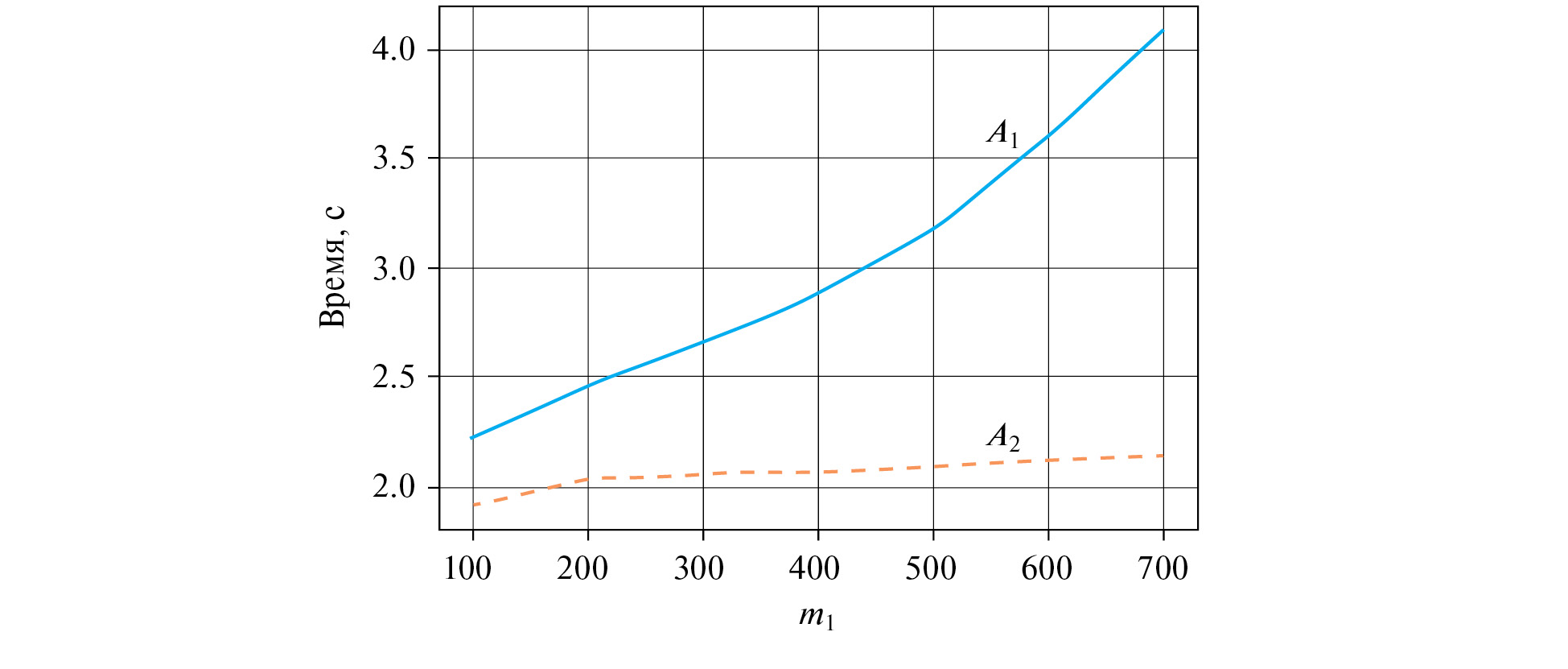 Рис. 1. Зависимость времени обучения моделей A1 и A2 от числа признаков при m1=250