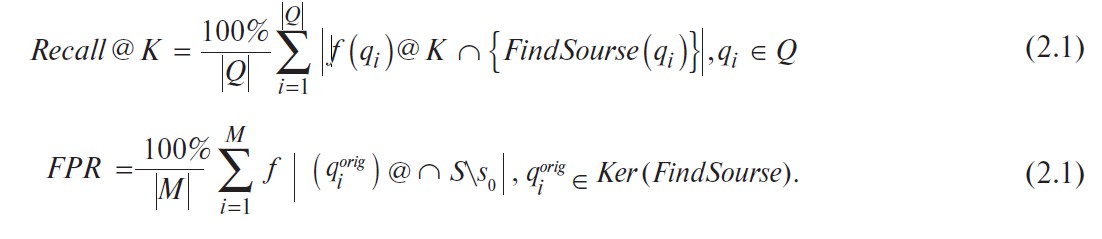 Введем модель поиска почти дубликатов f(q), q ∈ Q, выходом которой является множество {s1, ... ,sK, sk ∈ S, k = 1,K}, K ∈ N – заранее фиксированное число кандидатов на источник почти дублирования.