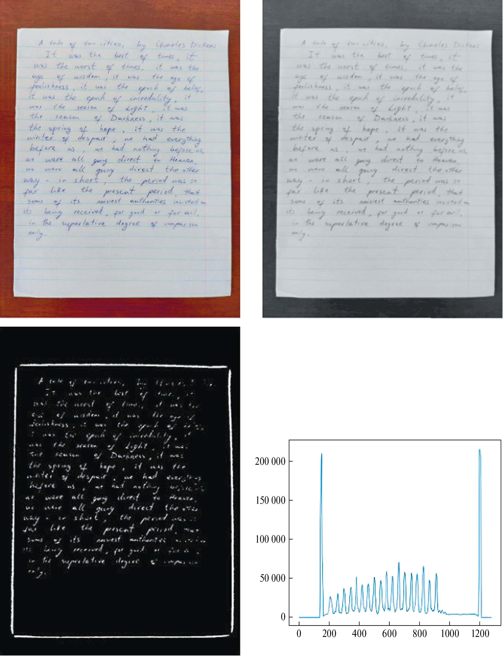 Другим подходом к данной части задачи выступают методы, используемые для анализа временных рядов. Так как почти дубликатом работы служит изображение, где текст расположен на том же (или почти том же) регионе, то текст входного изображения работы можно определить как некоторый сигнал. В рамках такого рассмотрения задачи в нашей работе извлекался сигнал из изображения (рис. 3). Для получения сигнала сначала цветное изображение преобразовывалось в черно-белое, затем выделялся рукописный текст с помощью фильтрации по яркости. Затем матрица изображения суммировалась по строкам. Далее из сигнала извлекались максимумы как наиболее информативная часть. После этого подсчитывалась схожесть между сигналом работы запроса и работы-кандидата. Схожесть определялась как Евклидово расстояние между последовательностями. Для вычисления Евклидова расстояния был использован алгоритм динамической трансформации временной шкалы (dynamic time wrapping (DTW)). Одним из практических применений алгоритма DTW является онлайн проверка подписи [26]. В работе был использован алгоритм FastDTW [27] – аппроксимация DTW, имеющая линейную вычислительную сложность вместо квадратичной у полной DTW. Для классификации изображения как почти дубликат или оригинал найденная схожесть между запросом и кандидатом сравнивалась с подобранным порогом. При превышении порога изображение считалось почти дубликатом, а кандидат отбирался как источник почти дублирования. Распространенными методами решения задачи сравнения изображений являются методы извлечения опорных точек (keypoint-extraction) от подходов классического компьютерного зрения: SIFT [28], ORB [29], до нейросетевых [30, 31]. Различные алгоритмы извлечения ключевых точек (SIFT, ORB или нейронные сети) используются для выбора ключевых точек и вычисления их дескрипторов для каждого изображения-кандидата и изображения-запроса. Дескриптор – это объект, содержащий некоторую информацию о ключевой точке, на основе которой можно сделать вывод о сходстве или различии между двумя ключевыми точками. Подсчитывалось и нормировалось количество схожих ключевых точек. При превышении установленного порога запрос считался почти дубликатом, а кандидат отбирался как итоговый кандидат на оригинал.