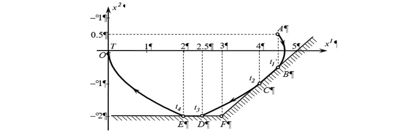 Значит, , поскольку состояние системы в момент находится на прямой . Фазовая траектория , соответствующая управлению и проходящая через точку , имеет вид . Она начинается в точке и заканчивается на прямой в точке . Время движения по этому участку .