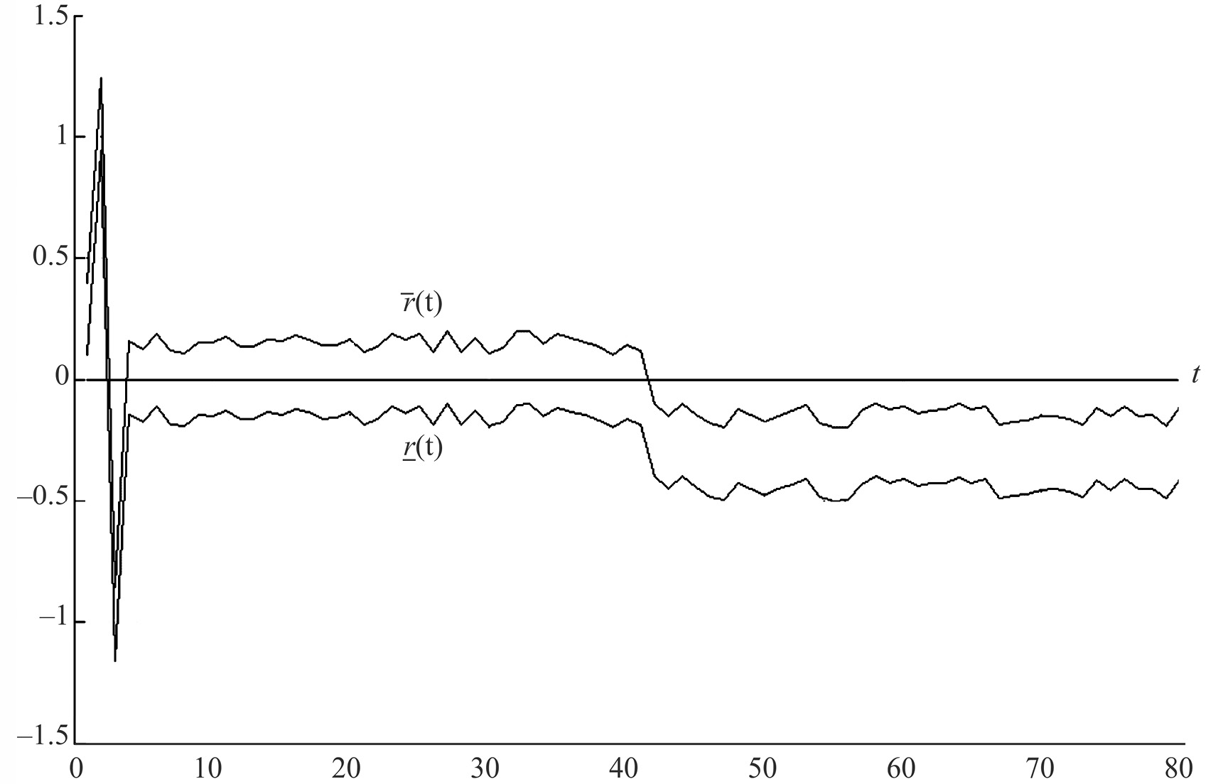 По сравнению с (3.1), соотношения паритета (3.2) содержат дополнительные члены и формирующие искомый интервал по аналогии с интервальным наблюдателем [14, 15]. Переменные и называются невязками, поскольку они описывают рассогласование между поведением системы (1.1) (представленным переменной ) и поведением соотношений паритета (представленными переменными и согласно (3.2)).