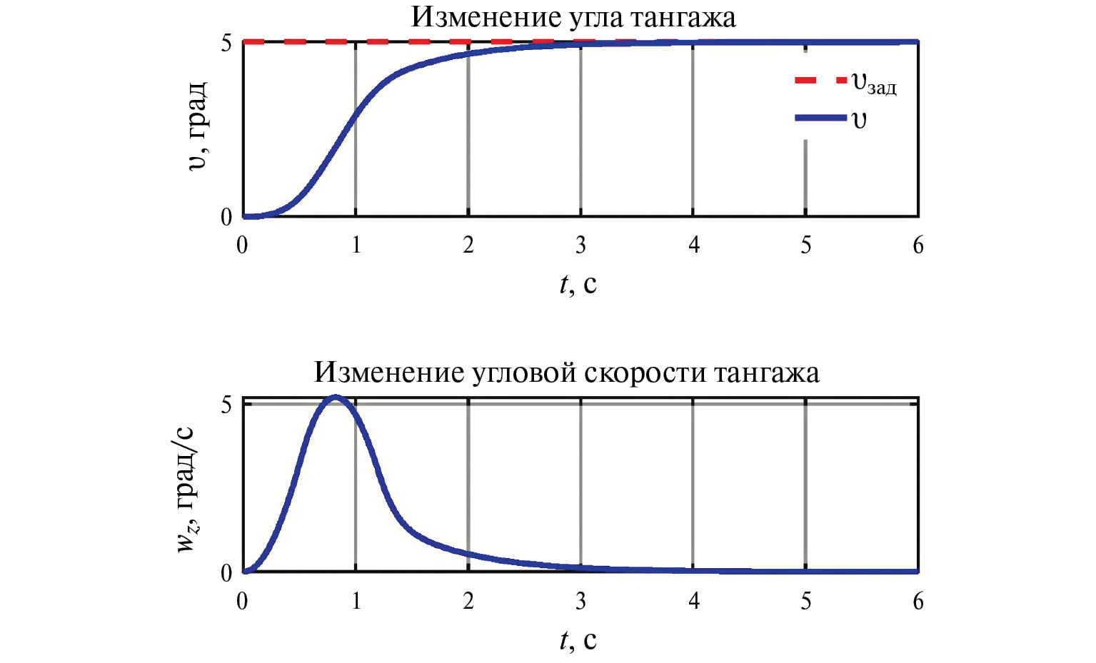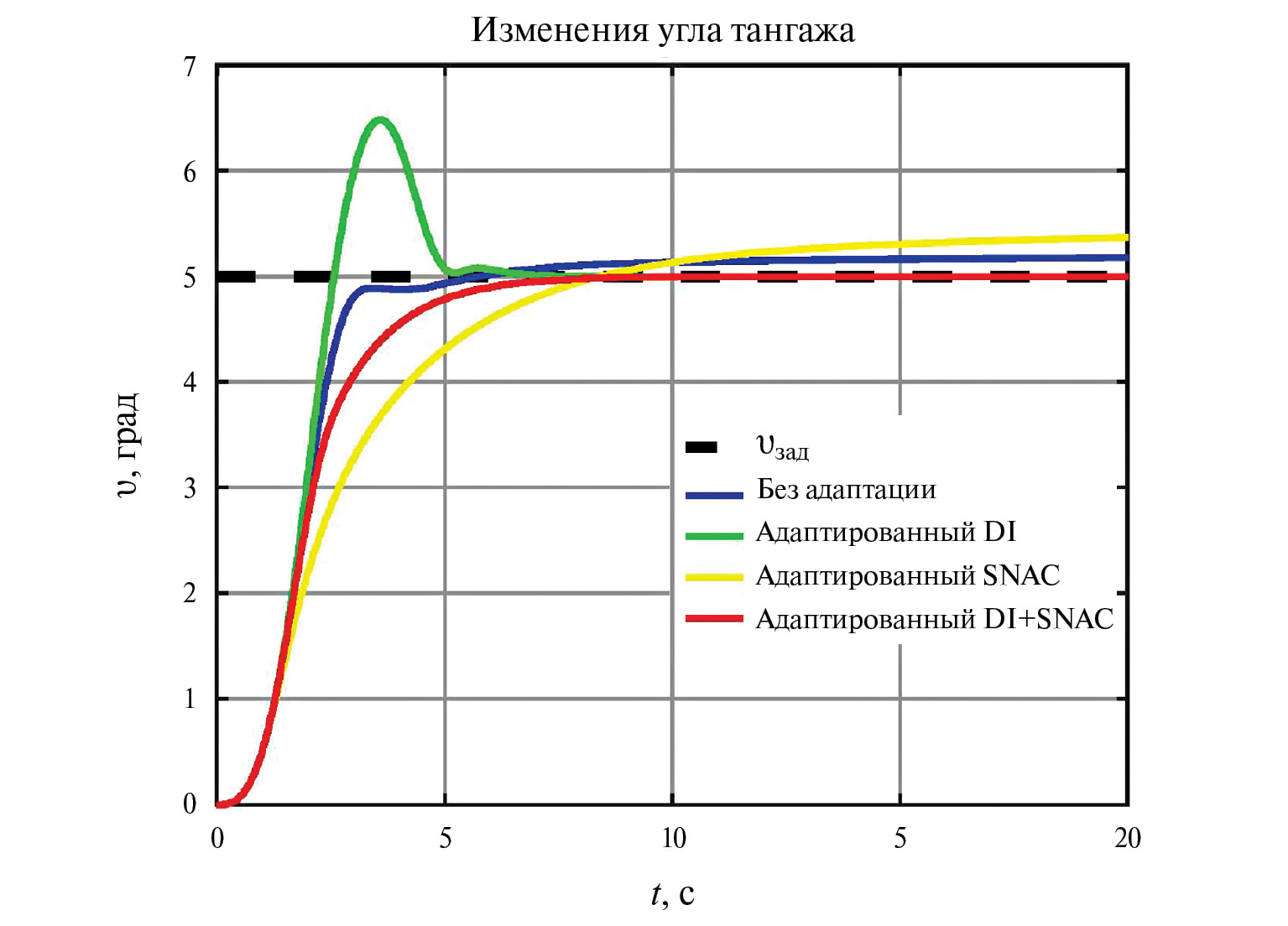 Рис. 5. Отработка заданного угла тангажа, равного 5°, при совместном использовании SNAC и DI.