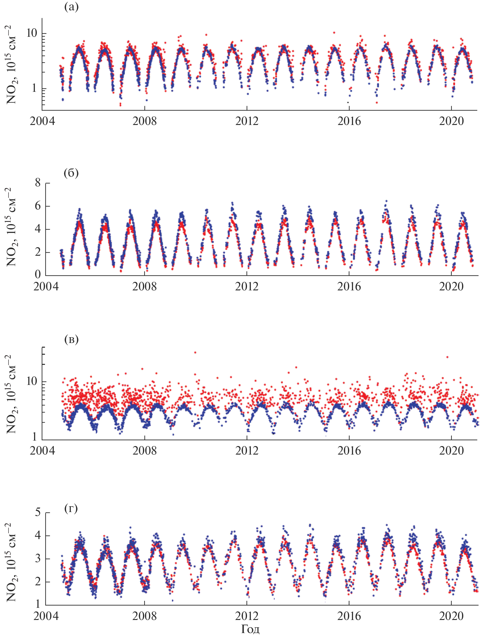 - Celarier E.A., Brinksma E.J., Gleason J.F., Veefkind J.P., Cede A., Herman J.R., Ionov D., Goutail F., Pommereau J.P., Lambert J.C., van Roozendael M., Pinardi G., Wittrock F., Schonhardt A., Richter A., Ibrahim O.W., Wagner T., Bojkov B. Mount G., Spinei E., Chen C. M., Pongetti T.J., Sander S.P., Bucsela E.J., Wenig M.O., Swart D.P.J., Volten H., Kroon M., Levelt P.F. Validation of Ozone Monitoring Instrument nitrogen dioxide columns // J. Geophys. Res. 2008. V. 113. № D15S15. https://doi.org/10.1029/2007JD008908