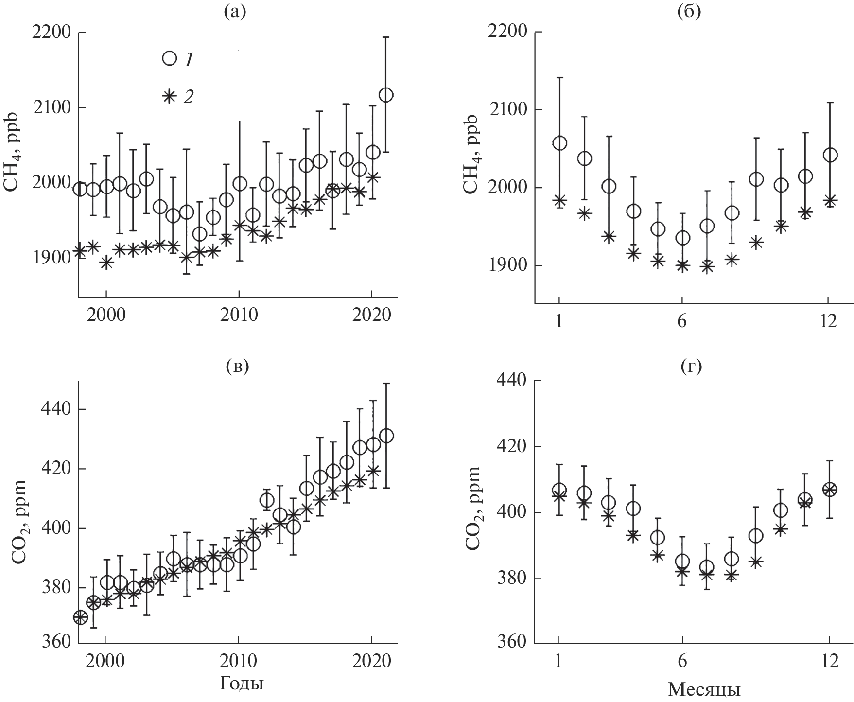 - Baranov Yu.I., Baranova E.L., Bougrim G.I., Kashin F.V. Temporal variability of methane, carbon oxide and dioxide and dinitrogen oxide in surface air // Proc. SPIE. 2000. V. 4341. P. 438–442.