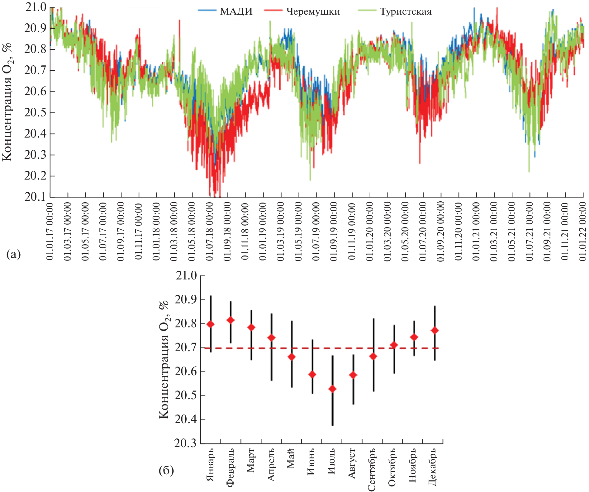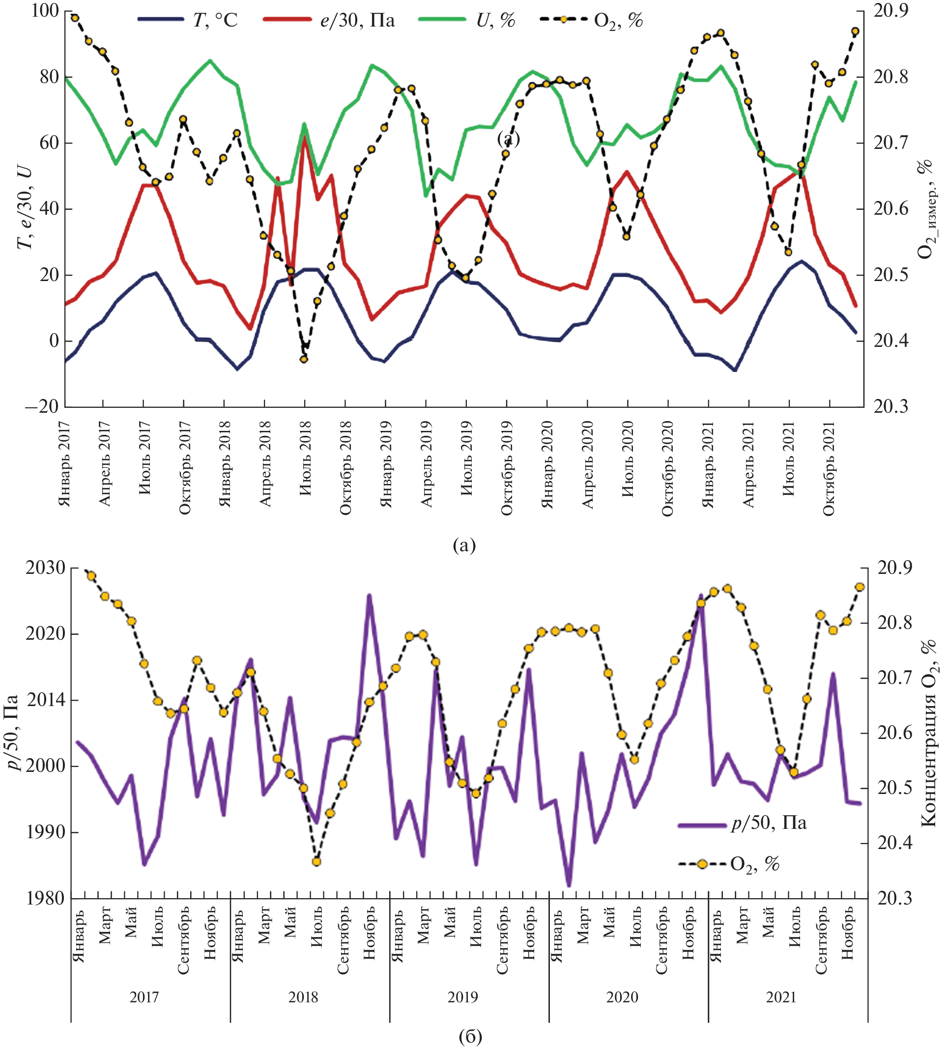 The article analyzes the results of measuring the oxygen content in Moscow in 2017–2021 at three automatic stations for monitoring atmospheric pollution of the “Mosecomonitoring”. Seasonal variations of oxygen content in the city are considered, the issues of compliance of the obtained values with the scale of comfort level for human breathing developed by medical specialists are discussed, measurement data are compared with the results of calculating the oxygen concentration in the air by the magnitude of meteorological parameters. According to the measurements, diurnal variations of the O2 content in the surface urban air, more pronounced in the warm season, were revealed. The minimum O2 content is observed in summer in the early morning hours. The main natural and anthropogenic processes that determine the variability of oxygen content in the surface air of a megalopolis at different time scales are discussed.