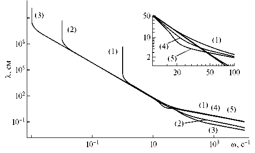 Численные расчеты показывают, что увеличение значения зарядового параметра W приводит к уменьшению длины волны при заданной частоте в области капиллярно-гравитационных волн и не оказывает заметного влияния в области гравитационных и капиллярных волн. Графики зависимости длины волны от частоты волнового движения в диапазоне 0,001 < ω < <10000 c–1 для жидкости с параметрами воды (ρ00=1г/см3, σ = 72 эрг/см3, ν = 0.01 Ст) при различных значениях параметра W, определяющего поверхностный электрический заряд, и частоты плавучести приведены на рис. 1.