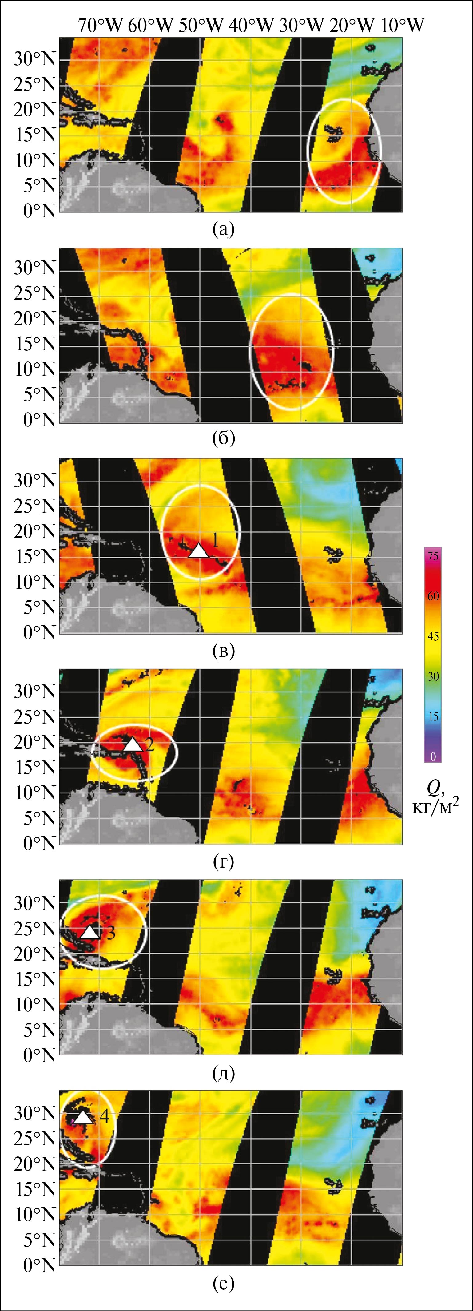 Рис. 6. Эволюции поля ОВА (Q) в тропической зоне Атлантики по данным измерений радиометров SSM/I спутников F11, F13, F14 на восходящих (A) и нисходящих (D) витках в период, предшествующий зарождению ТУ Bonnie: (а) ‒ 15.08 (F14 D); (б) ‒ 17.08 (F14 A); (в) ‒ 19.08 (F11A); (г) ‒ 21.08 (F13 D) и в период его развития: (д) ‒ 23.08 (F14 D); (е) ‒ 25.08 (F13D). 1 – тропическая депрессия; 2 – тропический шторм; 3, 4 – тропический ураган (по данным [Avila, 1998]). Слепые области (вне видимости радиометров) выделены черным цветом.