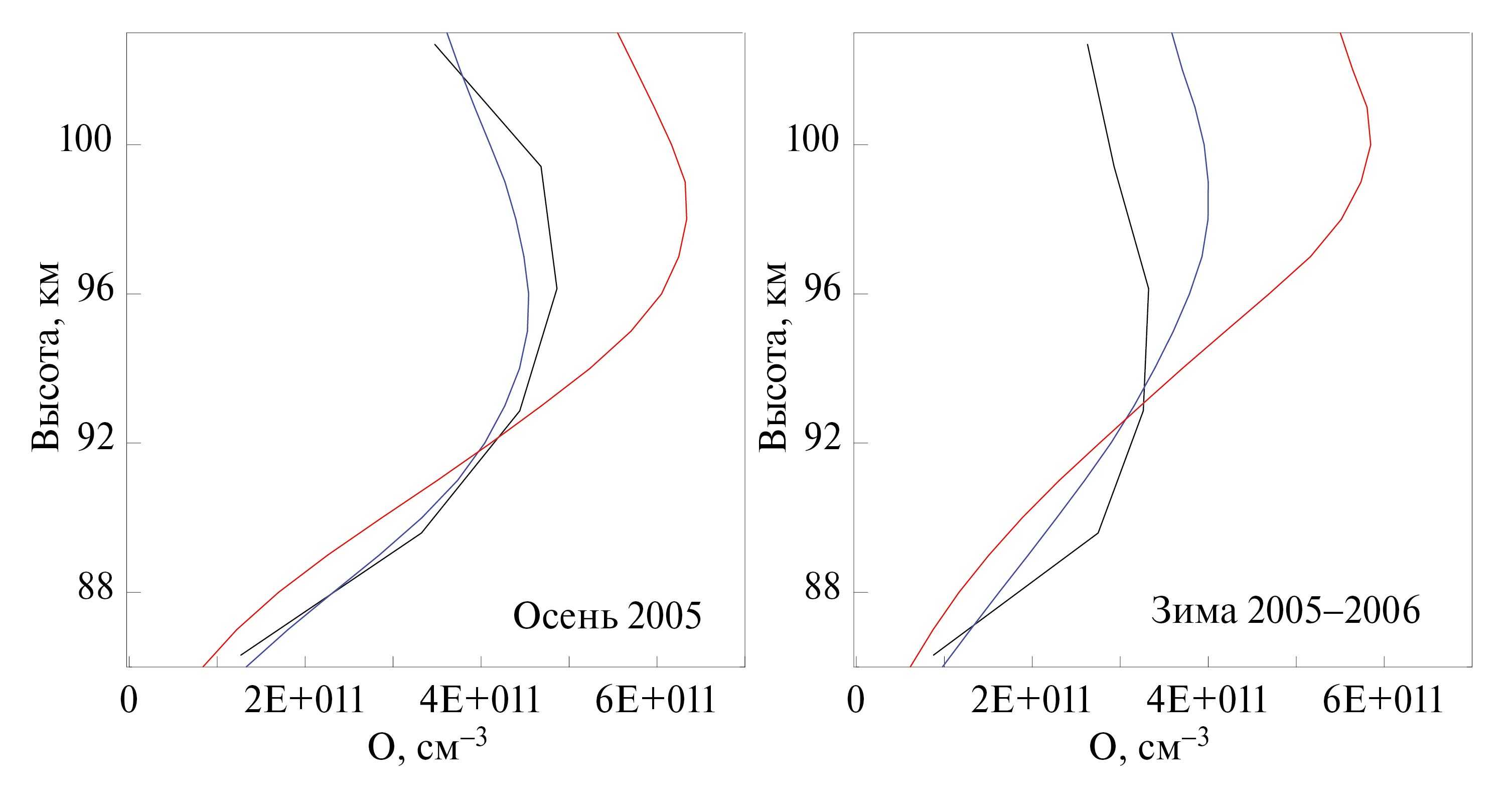 Рис. 6. Вертикальные профили О, усредненные в диапазоне 0–20°N за осень 2005 (левый) и зиму 2005–2006 гг. (правый) соответственно, отвечающие модернизированной модели ОН* (синие линии) и модели [Mlynczak et al., 2013a, 2018] (красные) в сравнение с результатами восстановления (черные линии) этой компоненты по данным измерений свечения O(1S) прибором SCIAMACHY [Kaufmann et al., 2014].