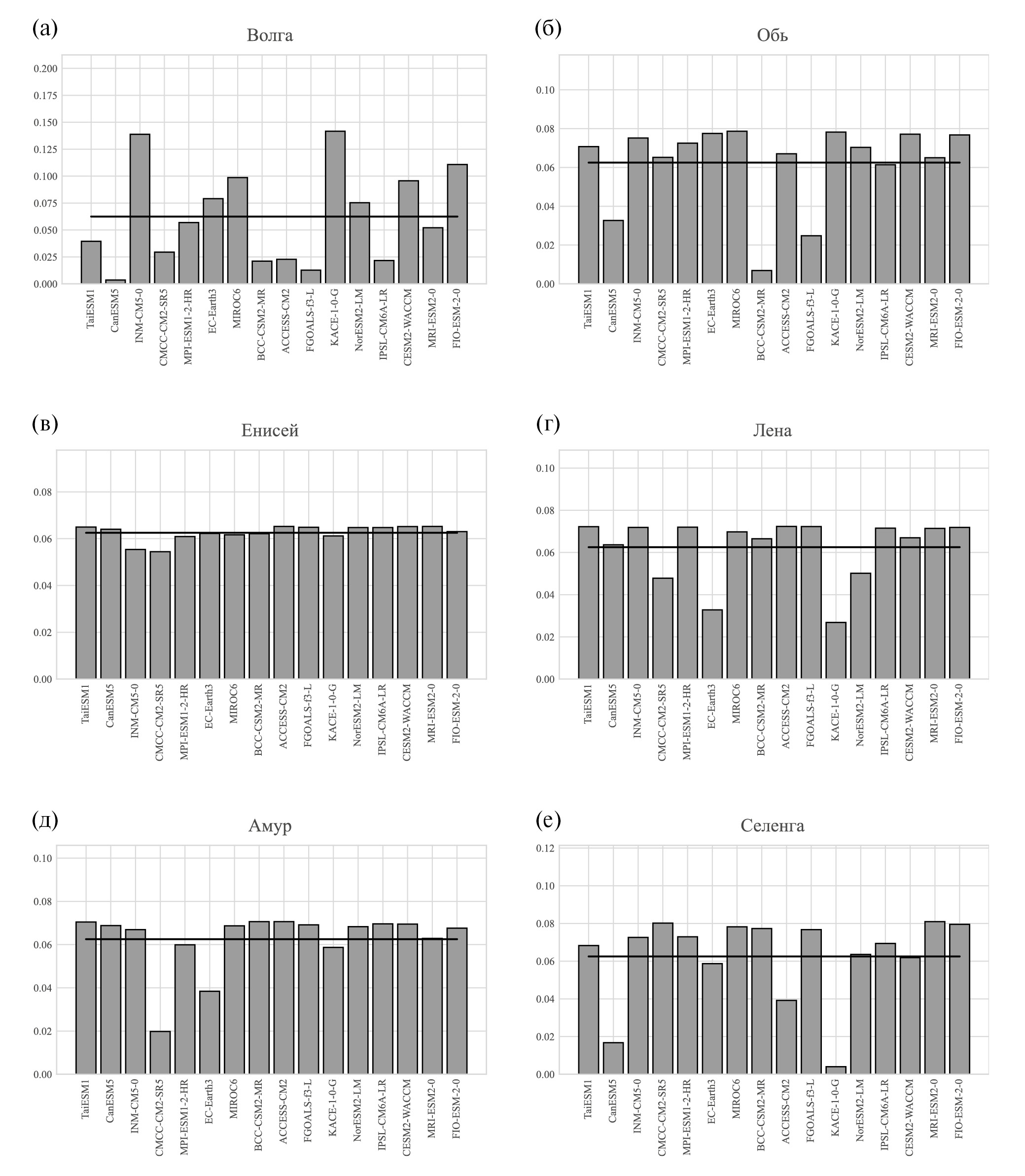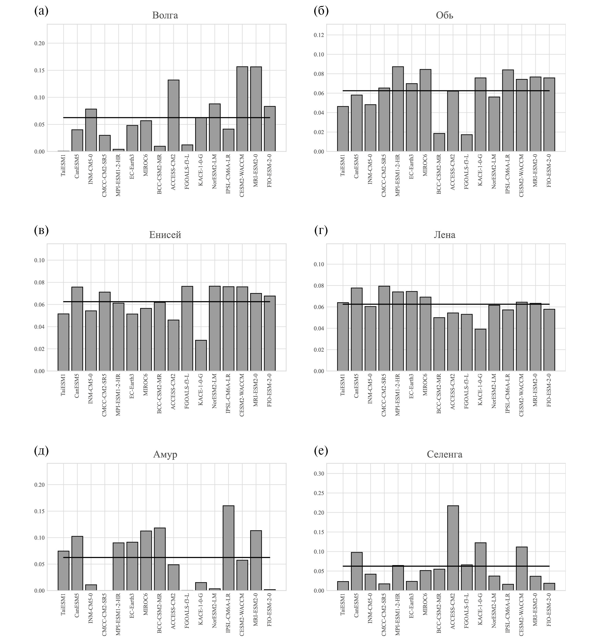 При анализе использовались результаты расчетов среднемесячных значений полного стока с моделями ансамбля CMIP6 (CMIP переменная mrro) при сценариях “historical”, SSP1-2.6, SSP2-4.5 и SSP5-8.5 [Gidden et al., 2019] (табл. 1). Они осреднялись по водосборам ряда рек — Амур, Лена, Обь, Енисей, Селенга, Волга, выделенных согласно [Graham et al., 1999] с разрешением по широте и долготе (рис. 1, табл. 2). Все эти водосборы достаточно велики для достаточного адекватного учета их в современных моделях Земной системы, типичное горизонтальное разрешение которых – порядка 102 км [Climate Change, 2021]. При наличии расчетов с разными начальными условиями для одной и той же модели анализировался только один из них (в архиве CMIP6 обозначенный как i1). Использование переменной полного стока обусловлено тем, что годовое стокообразование в бассейне должно точно совпадать при условии отсутствия значительного заполнения подземных резервуаров: фактор, который не учитывается в моделях. В качестве эталонных данных для стока были использованы данные сайта https://gmvo.skniivh.ru/index.php?id=1 о расходах воды, выбранных для анализа рек.