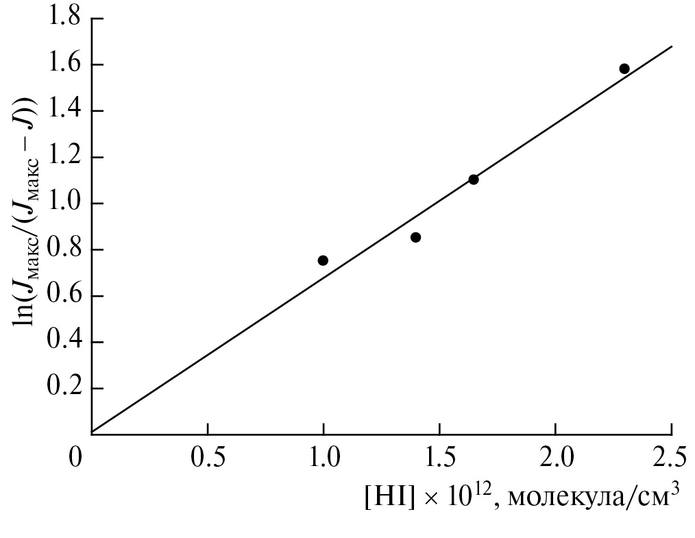 Рис. 2. График зависимости ln(J0/J) от концентрации [HI]. (T = 298˚K, P = 1.1 Торр, время реакции 0.0083 с. Разбавителем служил гелий. Измерялся сигнал РФ атома хлора.)