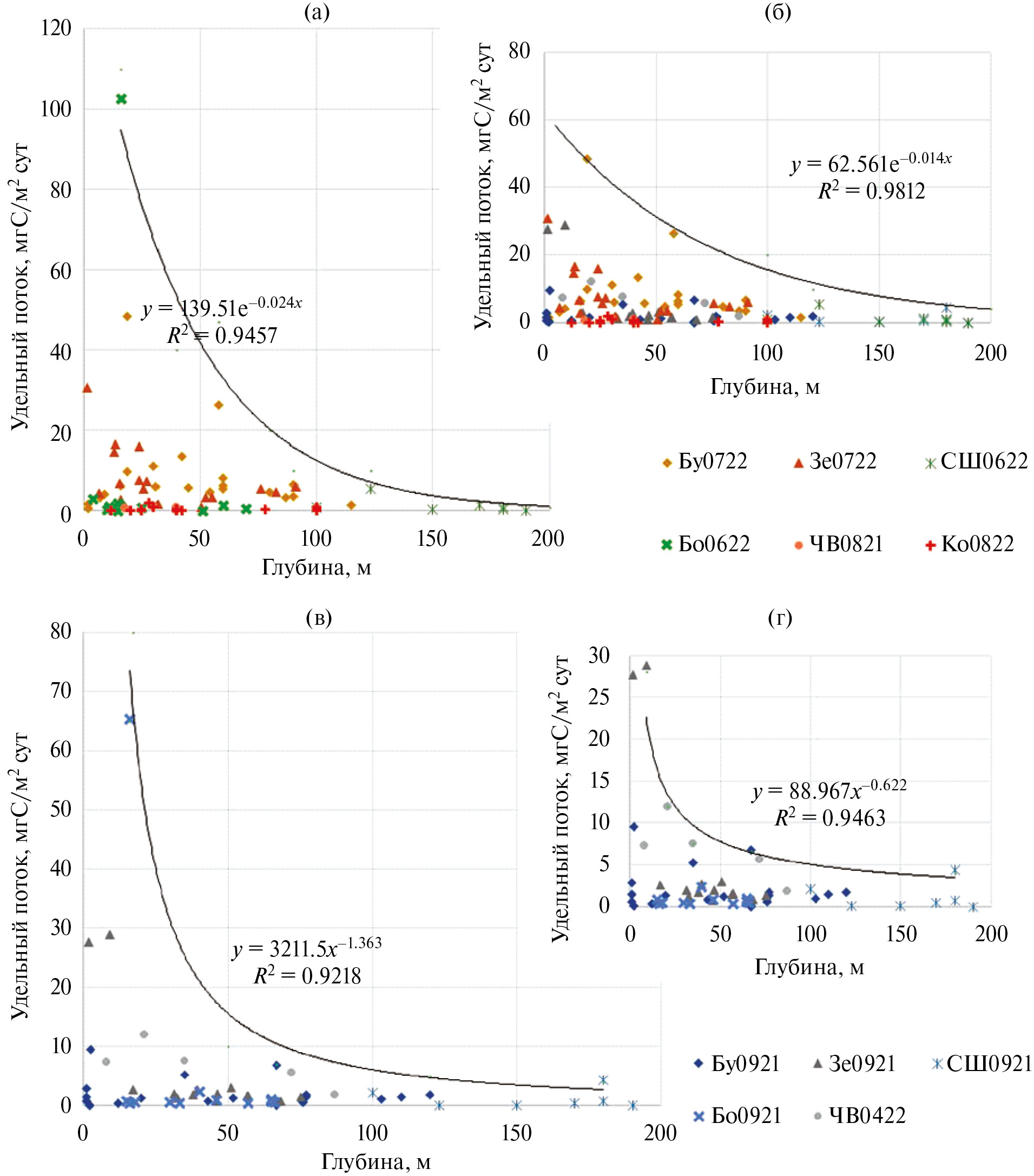 Рис. 2. Зависимость удельного потока метана от глубины с районов глубоководных водохранилищ: 2а – в периоды стратификации, 2в – при отсутствии стратификации, 2б и 2г – без учета локального максимума в Ковинском плесе Богучанского водохранилища (затопленное болото).