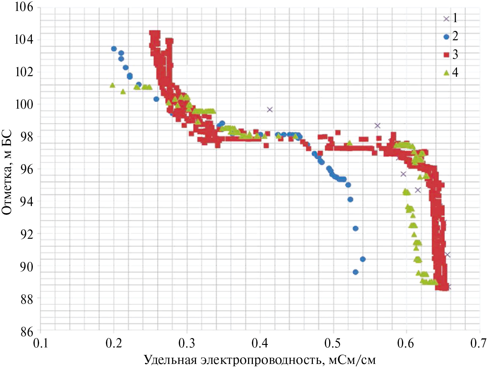 Рис. 2. Изменение удельной электропроводности воды по глубине в районе водозабора ЧОС (1 – апрель 2018 г., 2 – марта 2020 г., 3 – январь 2021 г., 4 – апрель 2021 г.).