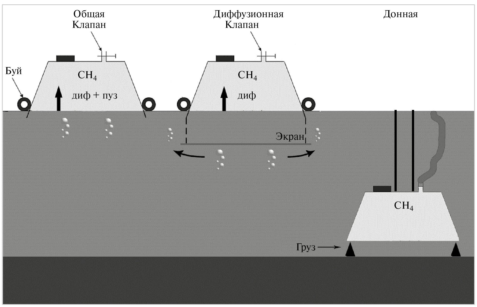 Рис. 2. Схема «плавучей камеры» для измерения удельного потока метана на границе «вода – атмосфера» и «донной камеры» для измерения удельных потоков метана на границе «донные отложения – вода».