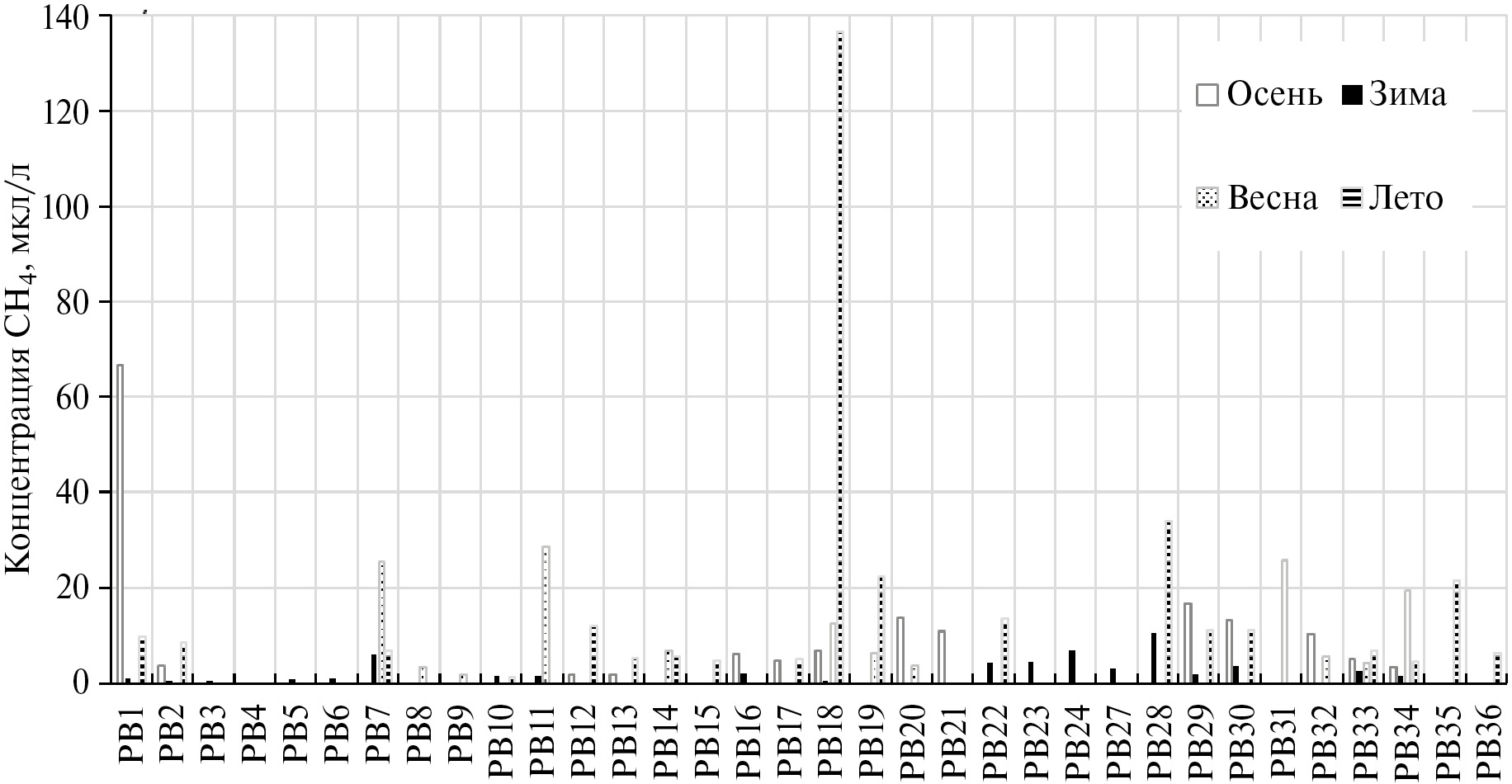 Рассмотрим изменчивость содержания метана в Рыбинском водохранилище в различные сезоны. На рис. 7 представлен график распределения средней по вертикали концентрации метана в воде на станциях измерений. В целом для Рыбинского водохранилища характерны относительно невысокие концентрации метана – на большинстве станций среднее содержание растворенного в воде СН4 не превышает 20 мкл/л. Наименьшие концентрации наблюдались в зимний период. Это связано с невысокой интенсивностью потока метана из донных отложений из-за низких температур и насыщенности придонной воды кислородом. Удельный поток (УП) метана из донных отложений был измерен на трех станциях: РВ7, РВ11, РВ18 и наибольшее значение было измерено над затопленным руслом реки Ухра (РВ7), которое составило 7.55 мгСН4/м²в сут. На двух других станциях УП не превышал 1 мгСН4/м² в сут.