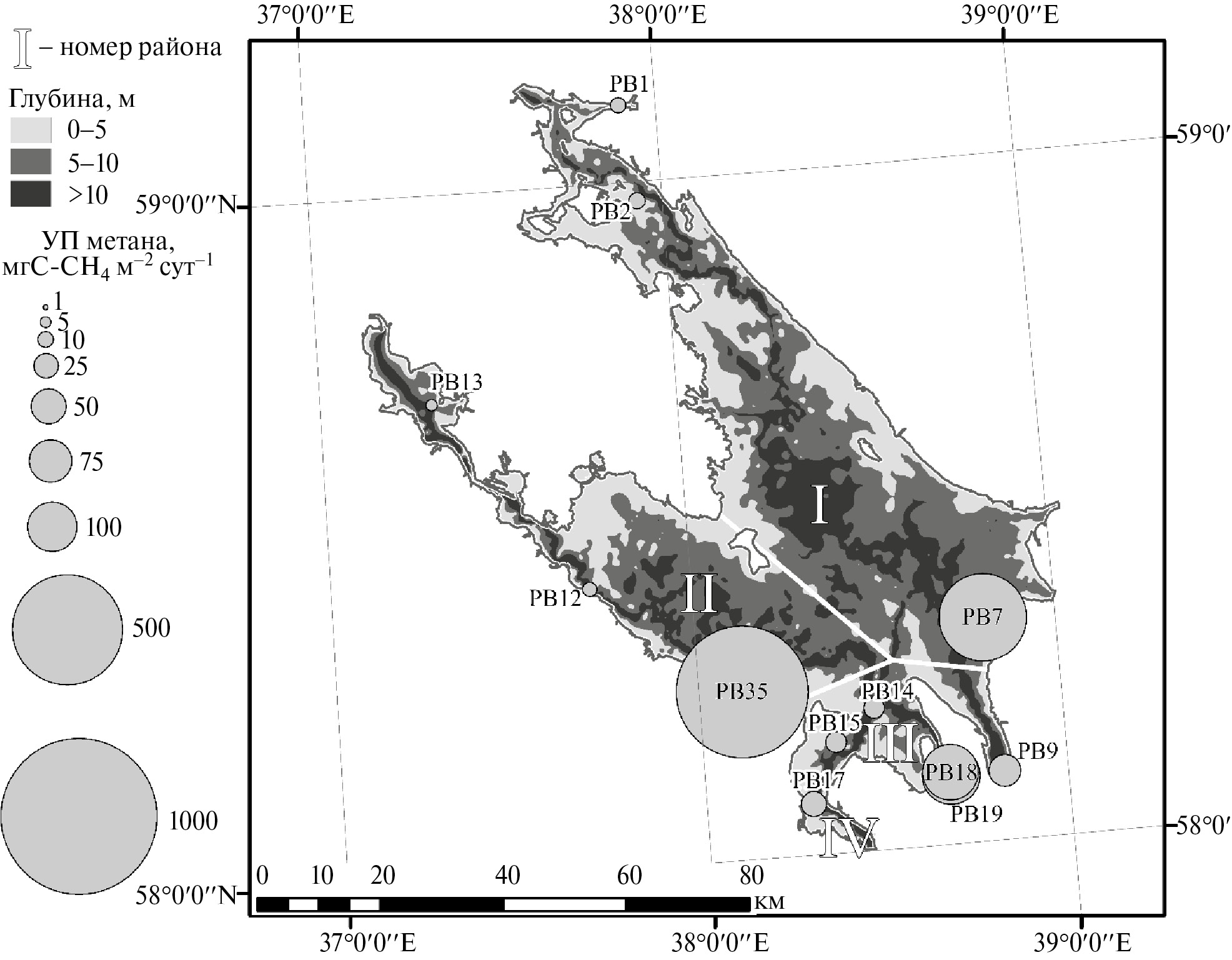 Рис. 11. Распределение удельных потоков метана с поверхности Рыбинского водохранилища, разделенного на 4 площадных района по результатам осенних полевых исследований.