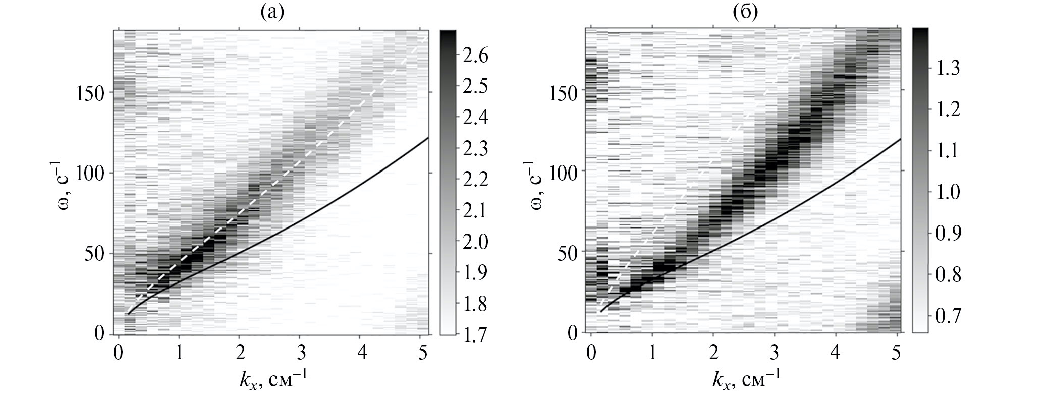 Рассмотрим два типичных спектра ветровых поверхностных волн, полученных экспериментально на основе измерения рельефа поверхности в течении некоторого времени и средней скорости дрейфа. Такой подход позволяет проанализировать задачу даже без знания профиля дрейфового течения. Эти данные вполне доступны и при натурных измерениях. На рис. 3 приведены результаты для воды (cкорость обдува vair = 4.64 м/с, скорость дрейфового течения на поверхности U0 = 12.3 см/с) и воды с добавлением SDS (cкорость обдува vair = 4.47 м/с, скорость дрейфового течения на поверхности U0 = 28.4 см/с). При данных скоростях область, на которой измеряется рельеф поверхности в воде, свободна от поверхностной пленки, а в воде с добавлением SDS пленка успевает восстанавливаться из обьема в процессе движения за счет дрейфового течения. На оба спектра также нанесены дисперсионные кривые ω(k): сплошная без учета движения поверхности (10), пунктирная с учетом доплеровского сдвига по скорости (11). Из рис. 3 видно, что в воде в рассматриваемом диапазоне волновых векторов толщина дрейфового течения оказывается больше длины волны и результат хорошо описывается доплеровским приближением. Такая ситуация типична для ветровых каналов при использовании чистой воды [Veron et al., 2001; Tagakaki et al., 2020]. При добавлении малой примеси SDS толщина дрейфового течения существенно уменьшается и по графику 3б можно даже определить характерную толщину слоя. Она соответствует таким обратным волновым векторам, при которых начинается смещение с кривой (10) в сторону зависимости (11). Очевидно, что расположение реальной дисперсионной кривой между двумя предельными значениями может трактоваться как изменение угла между течением и ветром (то есть доплеровская добавка берется с некоторым весом, зависящим от угла). Однако рис. 3б свидетельствует, что изменение влияния доплеровской добавки может происходить в рамках одного измерения при увеличении волнового вектора k, и такое изменение свидетельствует о влиянии толщины дрейфового течения.