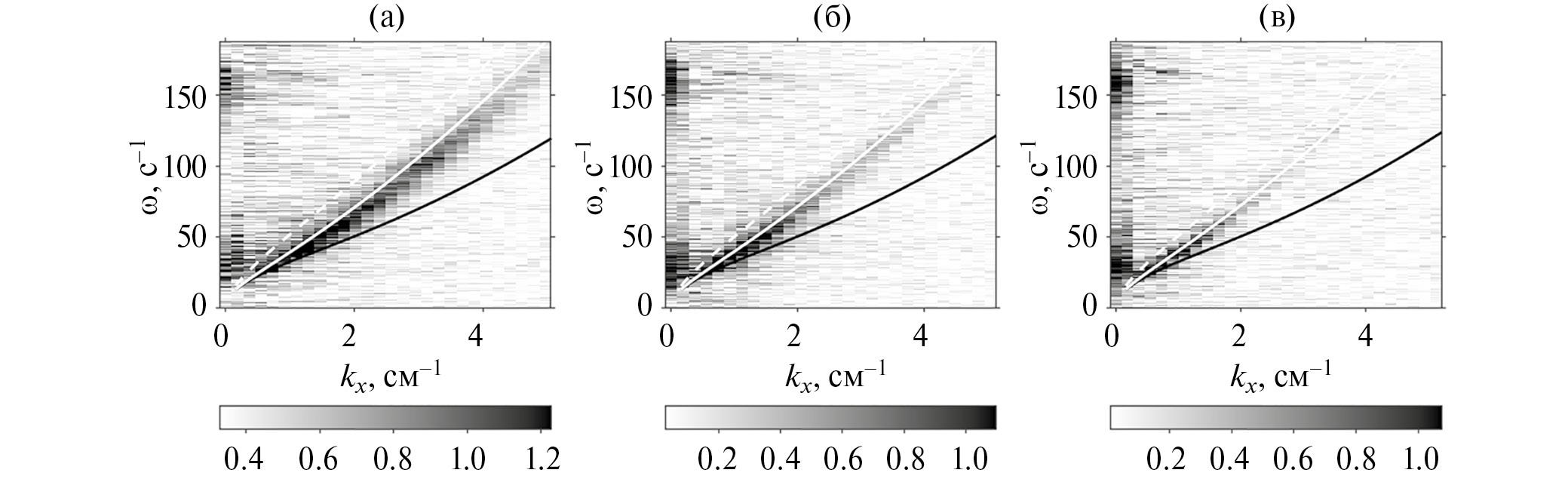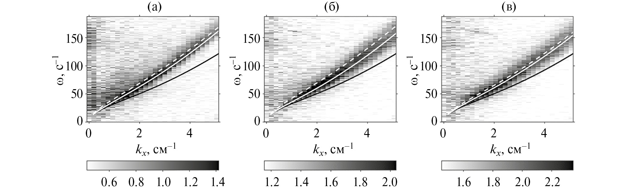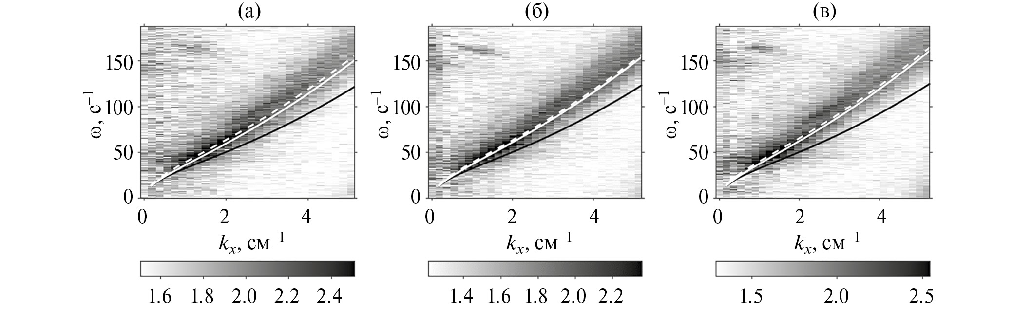 Рис. 5. Дисперсионные кривые для воды на расстоянии 40 см от начала канала. (а) vair = 1.49 м/с, U0 = 9.24 см/с; (б) vair = 2.24 м/с, U0 = 9.60 см/с; (в) vair = 3.32 м/с, U0 = 6.63 см/с. Черная кривая – расчет по формуле (10), пунктирная – расчет по формуле (11), светлая кривая – расчет с учетом профиля скорости. Цветовые шкалы показывают десятичные логарифмы амплитуды спектральной плотности