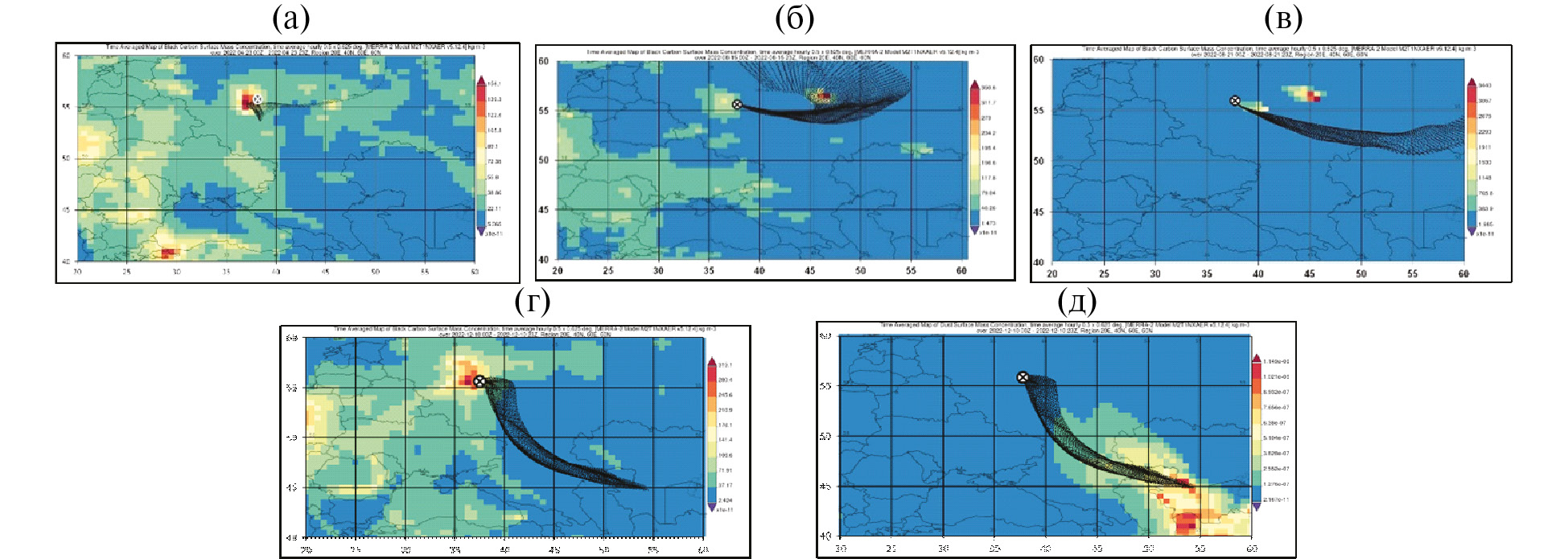 Рис. 2. Примеры траекторий (черные линии) переноса воздушных масс к Москве (круглый значок) на картах распределения концентрации черного углерода (а – 23.04.22; б – 15.08.22; в – 21.08.22; г – 10.12.22), а также на карте распределения концентрации пыли (д – 10.12.22) в приземном воздухе (по данным реанализа MERRA-2) над центром европейской части России