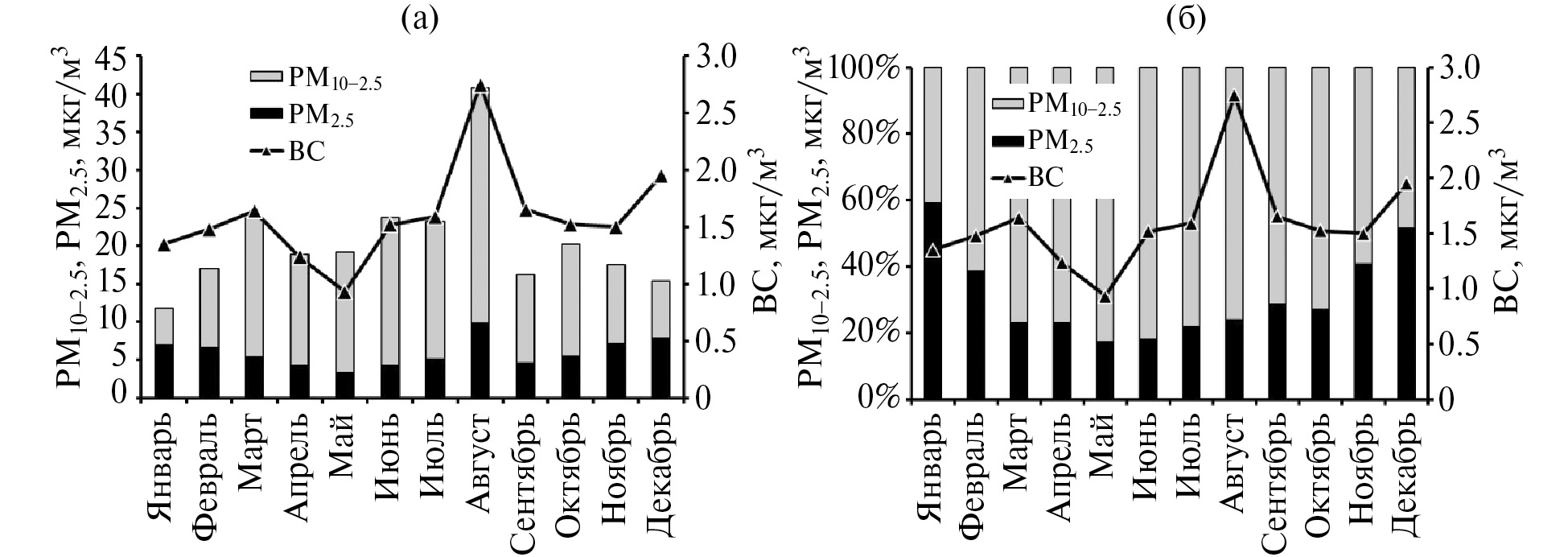 Рис. 3. Сезонный ход среднемесячных величин массовой концентрации черного углерода, а также грубодисперсных (РМ10–2.5) и высоко- и среднедисперсных (РМ2.5) аэрозольных частиц в центре Москвы в 2022 г.: а – абсолютные значения; б – абсолютные значения для ВС на фоне процентного соотношения массы частиц разной дисперсности