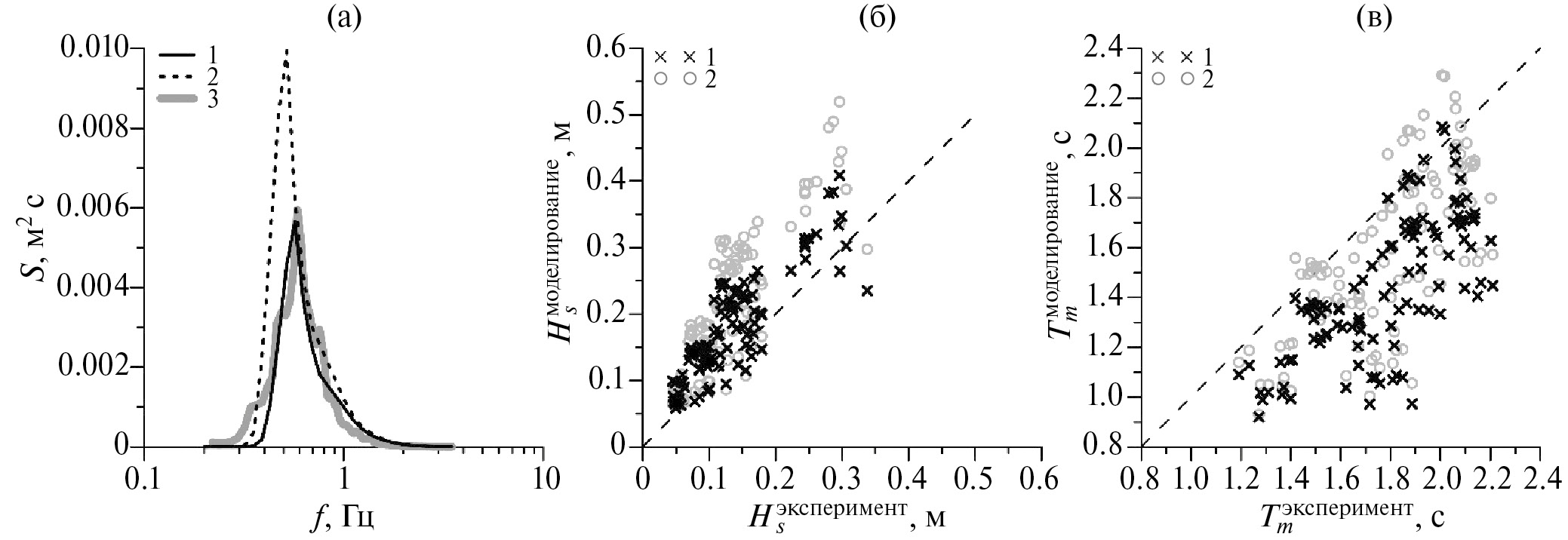 Рис. 4. (а) Одномерные спектры возвышений, (б) высоты значительных волн и (в) средние периоды волнения. 1 – WAM 3 с параметризацией (3), 2 – WAM 3 со стандартной параметризацией, 3 – экспериментальные данные