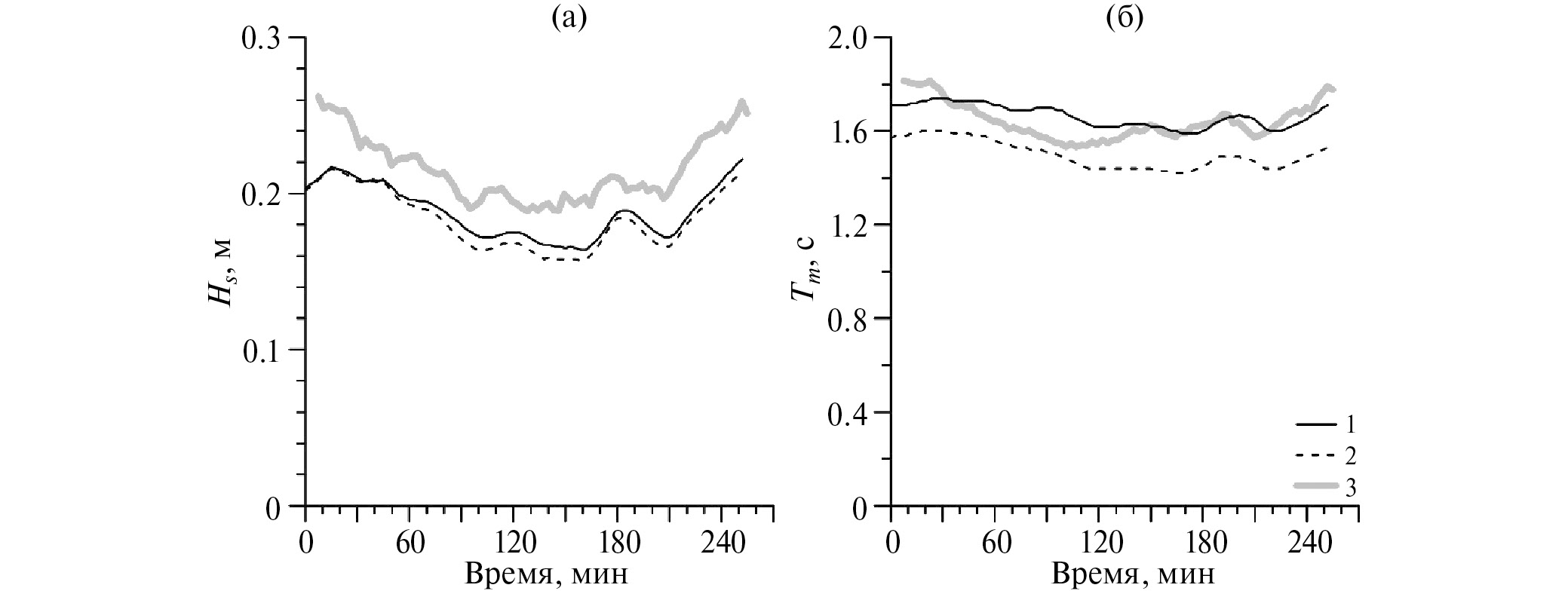 Рис. 5. (а) Высоты значительных волн и (б) средние периоды волнения для тестового дня 14.07.2017 при использовании параметризации WAM 3 с параметризацией (3). 1 – DIA с предложенными "оптимальными" параметрами, 2 – “дефолтная” версия DIA, 3 – экспериментальные данные