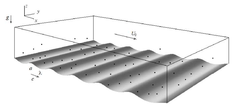 Постановка задачи схематично представлена на рис. 1 и в целом эквивалентна ранее использовавшейся постановке расчетов прямого численного моделирования (DNS) в [Druzhinin et al., 2017]. Рассматривается воздушный поток над взволнованной водной поверхностью, несущий капли. Верхняя граница области счета плоская и движется в направлении распространения поверхностной волны со скоростью U0, связанной со средней, характерной скоростью ветра в лабораторных или натурных условиях. Нижняя граница совпадает с водной поверхностью, на которой распространяется двумерная, стационарная волна с амплитудой a, длиной λ и фазовой скоростью c; крутизна волны ka = 2πa/λ задается равной ka = 0.1. Значения U0 и λ определяют масштабы скорости и длины задачи, на которые далее нормируются все переменные.