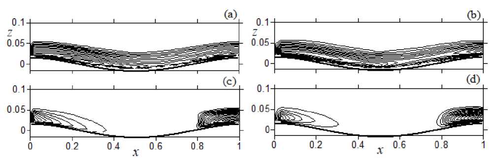 где безразмерное волновое число k = 2π. Преобразование (13) переводит область с волнообразной нижней границей в область, ограниченную нижней плоской границей при η = 0. Форма водной поверхности задается неявно преобразованием (13) и с точностью до членов второго порядка малости по совпадает с решением, описывающим волну Стокса [Gent, Taylor, 1976]. Используется также дополнительное преобразование вертикальной координаты, обеспечивающее сгущение узлов расчетной сетки по вертикали и разрешение больших градиентов в пограничных слоях, формирующихся вблизи верхней и нижней границ области счета.