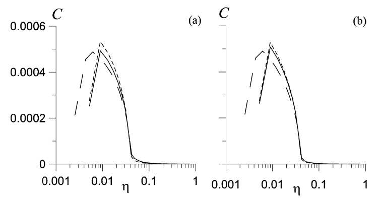Как видно из рис. 4, результаты расчетов LES и DNS для концентрации капель довольно хорошо согласуются во всех рассмотренных случаях. При этом, как показывает рис. 5, применение форсинга (для учета подсеточных флуктуаций в динамике капель) незначительно улучшает согласие профилей концентрации в случае неоднородной инжекции (~ на 10%) и практически не влияет на профили C в случае однородной инжекции.