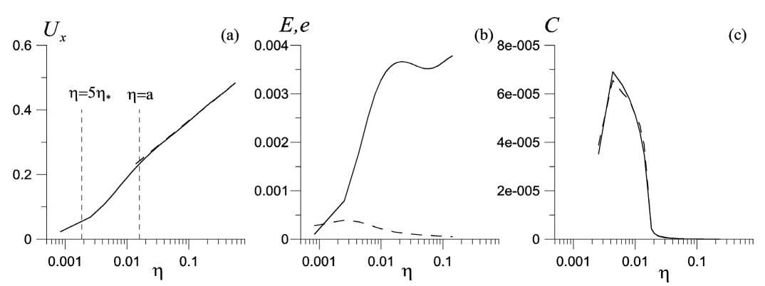Рис. 6. Профили средней скорости Ux (a), кинетической энергии пульсаций фильтрованного поля скорости и подсеточных пульсаций (b), и концентрации капель (c) в расчетах LES с числом Рейнольдса Re = 105. Расстояние от водной поверхности, равное высоте вязкого подслоя (η = 5η*) и амплитуде волны (η = a) отмечено коротким штрихом (а). Штрихом отмечена асимптотика (14) (а), кинетическая энергия подсеточных пульсаций (b), и концентрация капель в LES без использования стохастического форсинга (с).