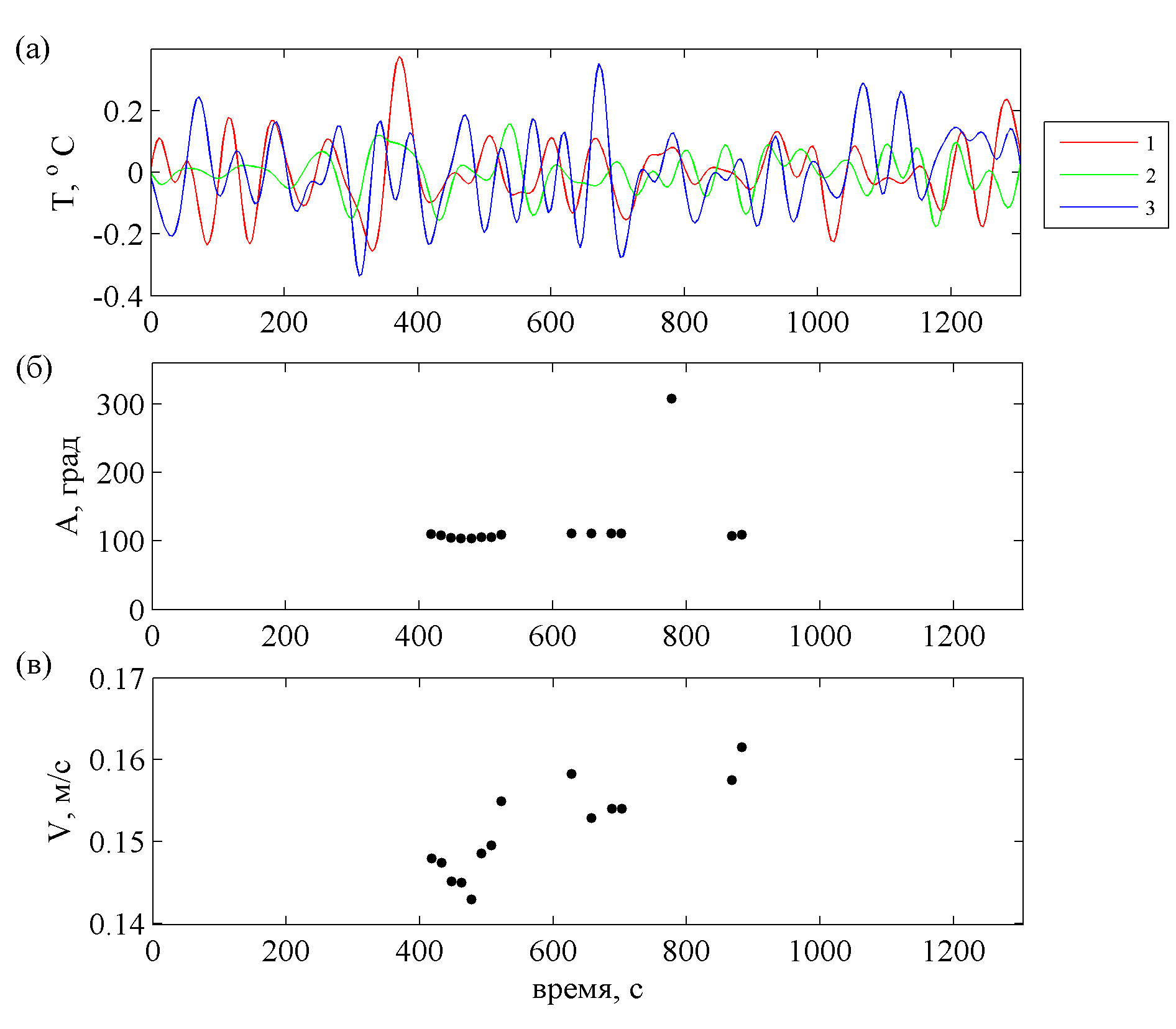 На рис. 2а показаны колебания температуры, отфильтрованные в диапазоне периодов 40–160 с, а на рис. 2б и рис. 2в — обратный азимут (угол между направлением от приемника к источнику волн и направлением оси судна от кормы к носу) и горизонтальная фазовая скорость волн в зависимости от времени, соответственно. Эти параметры слабо меняются в промежутке времени от 400 до 700 с и равны примерно 108° и 0.15 м/c соответственно.