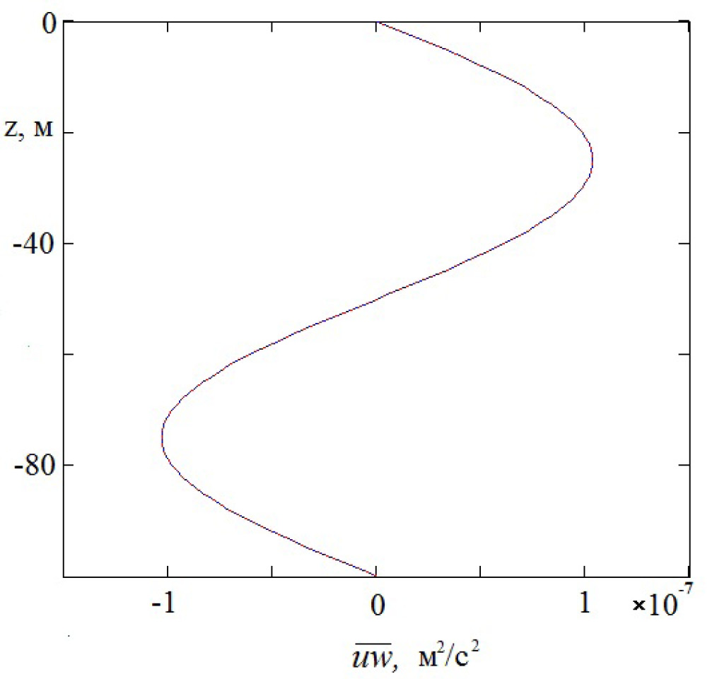 Черта сверху в (14), (15) означает осреднение по периоду волны. Вертикальный волновой поток импульса отличен от нуля при учете вращения Земли. Краевая задача (12), (13) имеет комплексные коэффициенты и комплексные решения. Поэтому поток не нулевой. При и fc = 0 уравнение (12) имеет действительные коэффициенты и действительные решения, поэтому в этом случае вертикальный волновой поток импульса равен нулю. Если вращение Земли не учитывать, то уравнение (12) имеет действительные коэффициенты, решение краевой задачи (12), (13) — действительная функция и вертикальные волновые потоки импульса нулевые. Если волна распространяется под произвольным углом к плоскопараллельному потоку, то при отсутствии учета вращения Земли решение краевой задачи, аналогичной (12), (13) — действительная функция в гидродинамически устойчивом случае [Bulatov and Vladimirov, 2020], когда число Ричардсона больше 1/4, частота волны действительная и вертикальный волновой поток импульса равен нулю.