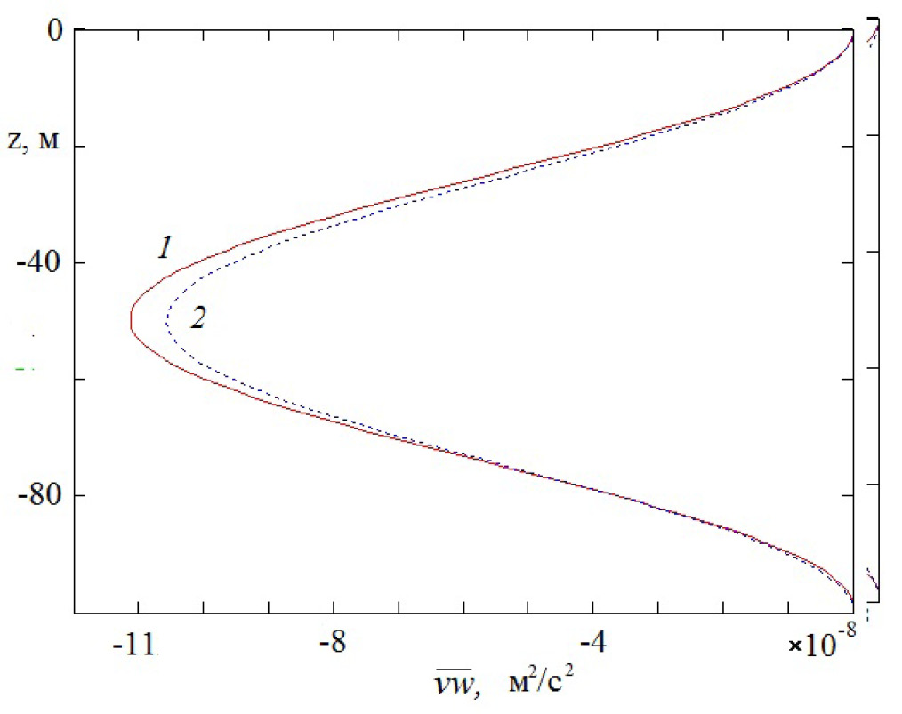 Рис. 4. Профили вертикального волнового потока импульса в горизонтально-неоднородном (1) и горизонтально-однородном (2) по средней плотности случае.