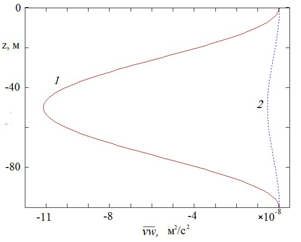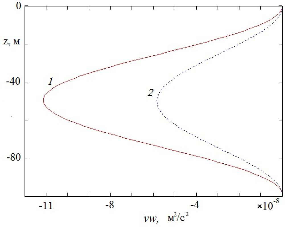 Рис. 5. Зависимость от вертикальной координаты волнового потока импульса при наличии течения (1) и при его отсутствии (2).