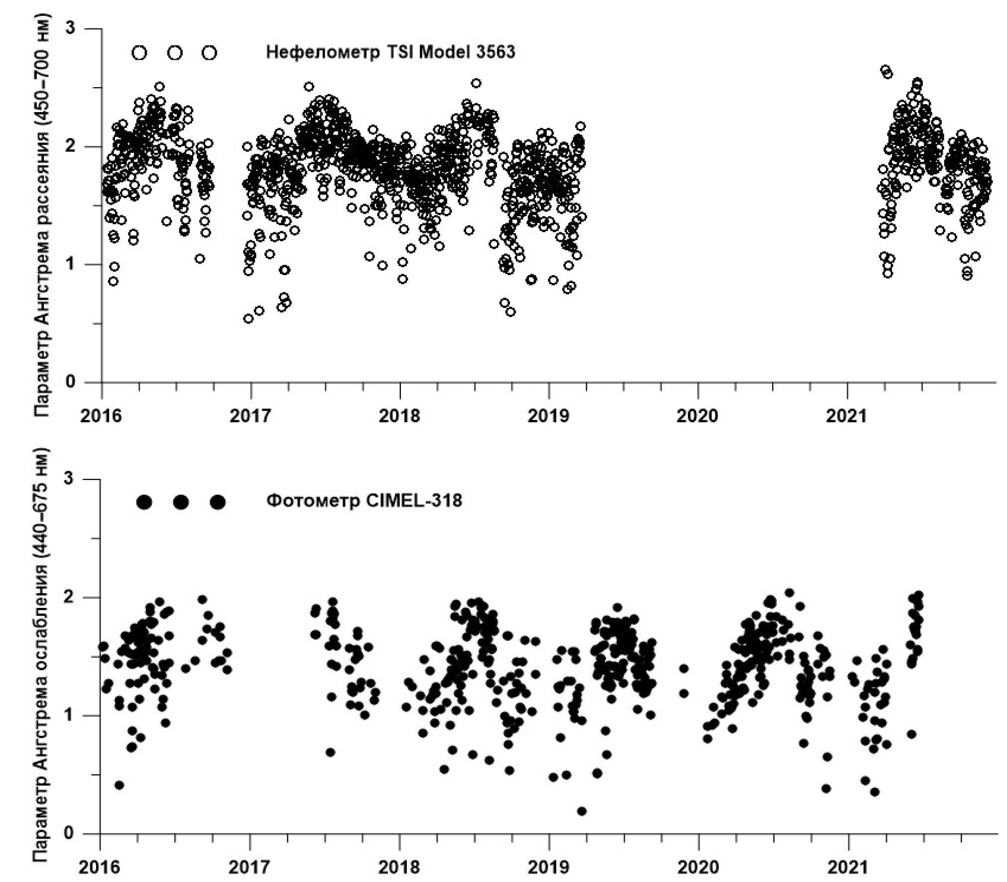 Среднее значение и среднеквадратичное отклонение (СКО) по данным нефелометра за весь период составило 1.82 ± 0.32, а по данным фотометра — 1.42 ± 0.32. Коэффициент корреляции между данными двух приборов был рассчитан на основе 263 пар и составил 0.66. При этом минимальная корреляция наблюдается зимой, а максимальная — весной. Величина показателя Ангстрема испытывает сильную межсуточную изменчивость, обусловленную, по-видимому, как близостью к потенциальным источникам загрязнения, так и географическими особенностями региона наблюдений с частой сменой воздушных масс. Вместе с тем, оба ряда данных измерений показателя Ангстрема демонстрируют ярко выраженный сезонный ход: в холодное время года наблюдаются минимальные значения (до 0.54 для нефелометра и 0.19 для фотометра), а летом — максимальные (до 2.66 и 2.04 соответственно).