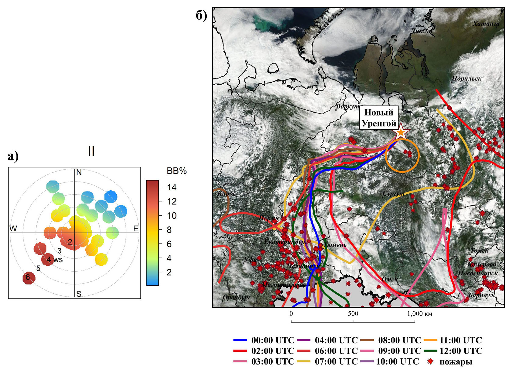 Расчеты двумерной функции распределения BB% в зависимости от скорости и направления во время эпизода загрязнения II (c 22 по 29 июля) указывают на источник высокого вклада, более 20%, в юго-западном направлении (рис. 5а). Согласно сводкам ФБУ «Авиалесохрана» данных дистанционного мониторинга [https://aviales.ru/] в этот период значительное число пожаров было зарегистрировано в таежных лесах Красноярского края, ХМАО, и ЯНАО общей площадью 4377 га, в лесных и лесостепных зонах Южного Урала и Поволжья общей площадью 1500 га. Траекторный анализ, проведенный 23 июля с целью определения направления регионального источника пожарных эмиссий во время достижения ВВ% наивысшего значения, показал перенос воздушных масс из Красноярского края и с северных территорий Казахстана (рис. 5б). Над территорией ЯНАО воздушные массы совершили поворот на северо-восток в направлении Нового Уренгоя, проходили над областями пожаров в Надымском и Пуровском районах ЯНАО.
