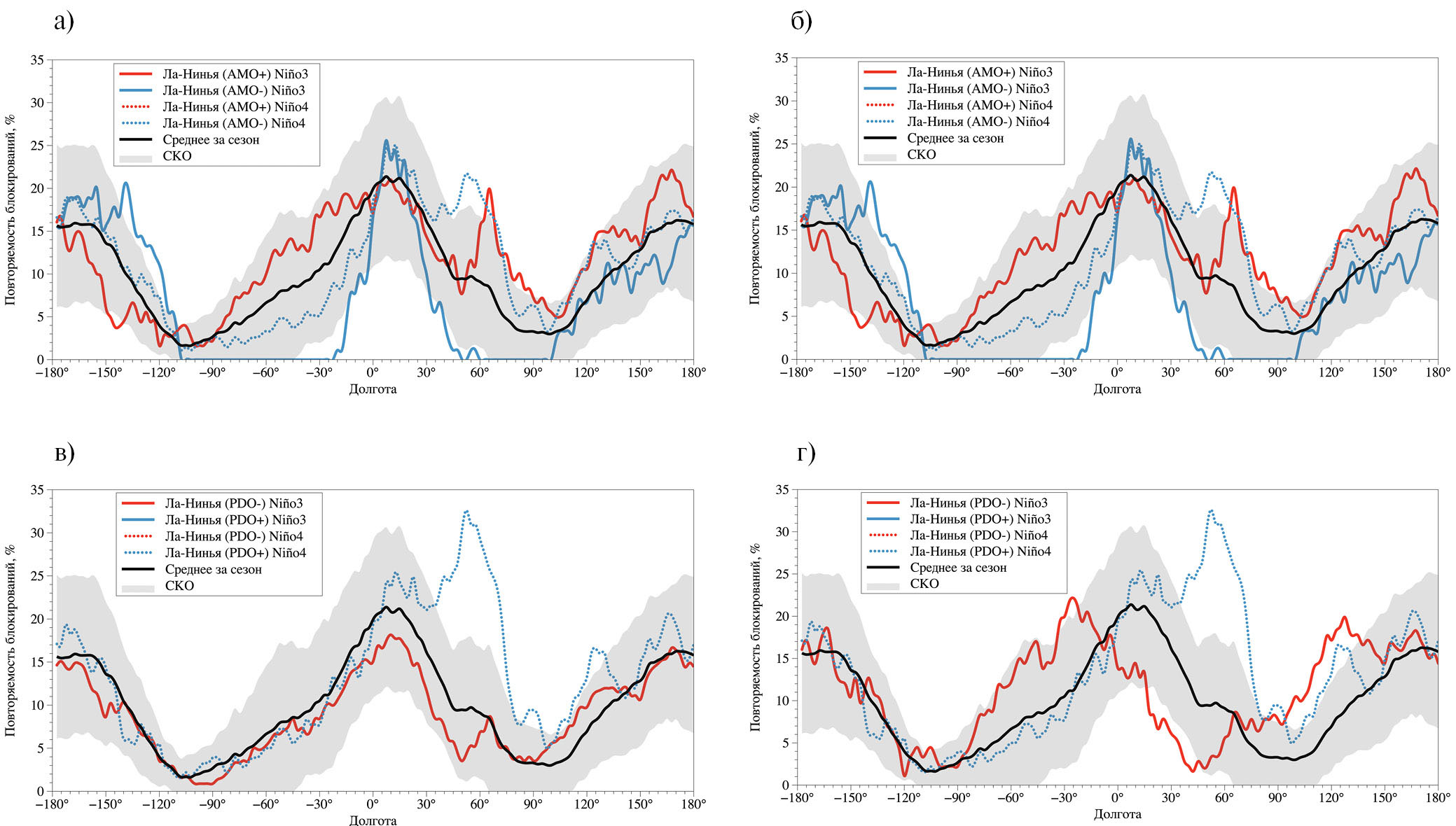 Рис. 4. Повторяемость зимних атмосферных блокирований в средних широтах Северного полушария в фазе Ла-Нинья с использованием индексов Nino3 и Nino4, при разных фазах АМО (а, б) и PDO (в, г) в вариантах I (а, в) и II (б, г) на фоне средних значений (с заштрихованным диапазоном СКО) для всего периода 1979–2018 гг.